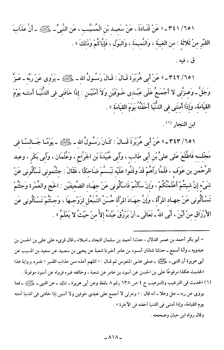 651/ 341 - "عَنْ قَتَادَةَ، عَنْ سَعِيدِ بْنِ الْمُسَيَّبِ، عَن النَّبِيِّ - صلى الله عليه وسلم - أَنَّ عَذَابَ القَبْرِ مِنْ ثَلاثَةٍ: مِن الغِيبَةِ، وَالنَّمِيمَةِ، وَالبَوْلِ، فَإِيَّاكُمْ وَذَلِكَ".