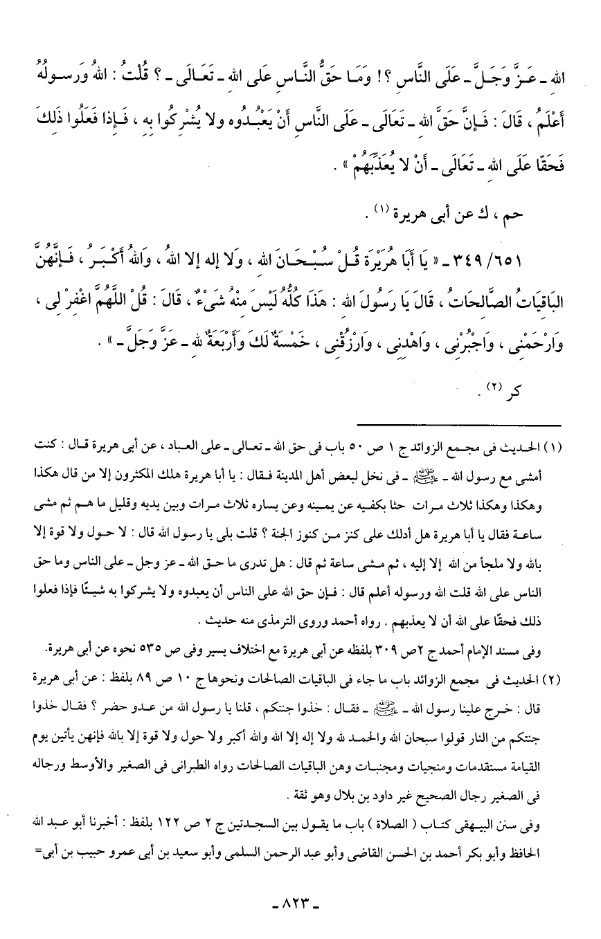 651/ 349 - "يَا أَبَا هُرَيْرَة قُلْ سُبْحَانَ اللهِ، وَلا إله إلا اللهُ، وَاللهُ أَكْبَرُ، فَإنَّهُنَّ البَاقِيَاتُ الصَّالِحَاتُ، قَالَ يَا رَسُولَ اللهِ: هَذَا كُلُّهُ لَيْسَ مِنْهُ شَيْءٌ، قَالَ: قُلْ اللَّهُمَّ اغْفِرْ لِي، وَارْحَمْنِي، وَاجْبُرْنِي، وَاهْدِنِي، وَارْزُقْنِي، خَمْسَةٌ لَكَ وَأَرْبَعَةٌ للهِ - عَزَّ وَجَلَّ-".