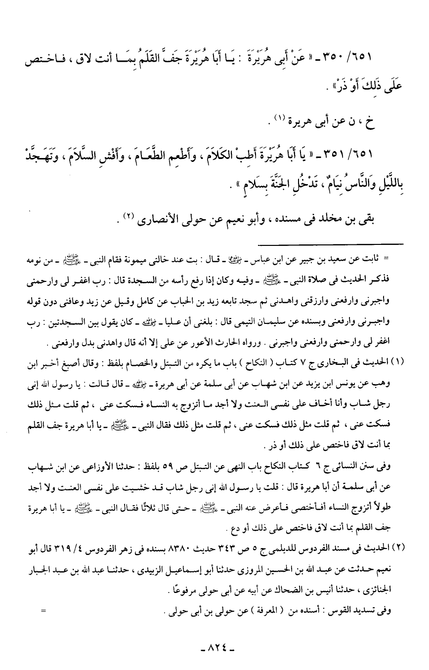 651/ 351 - "يَا أَبَا هُرَيْرَةَ أَطِبْ الكَلَامَ، وَأَطْعِم الطَّعَامَ، وَأَفْشِ السَّلَامَ، وَتَهَجَّدْ بِاللَّيْلِ وَالنَّاسُ نِيَامٌ، تَدْخُلِ الجَنَّةَ بِسَلامٍ".