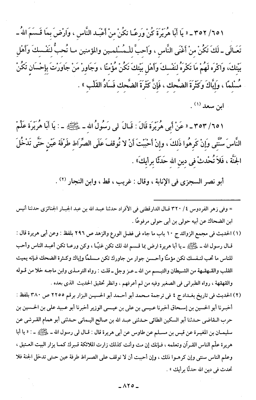 651/ 352 - "يَا أَبَا هُرَيْرَةَ كُنْ وَرِعًا تكُنْ مِنْ أَعْبَد النَّاسِ، وَارْضَ بِمَا قَسَمَ اللهُ - تَعَالَى- لَكَ تَكُنْ مِنْ أَغْنَى النَّاسِ، وَأحِبَّ لِلْمُسْلِمين والمؤمنين ما تُحِبُّ لِنَفْسِكَ وَأَهْلِ بَيْتِكَ، وَاكْرَه لَهُمْ مَا تَكْرَهُ لِنَفْسِكَ وَأَهْلِ بَيْتِكَ تَكُنْ مُؤْمِنًا، وَجَاوِرْ مَنْ جَاوَرْتَ بِإِحْسَانٍ تَكُنْ مُسْلِمًا، وَإِيَّاكَ وَكَثْرَةَ الضَّحِكِ، فَإِنَّ كَثْرَةَ الضَّحِكِ فَسَادُ القَلْبِ".