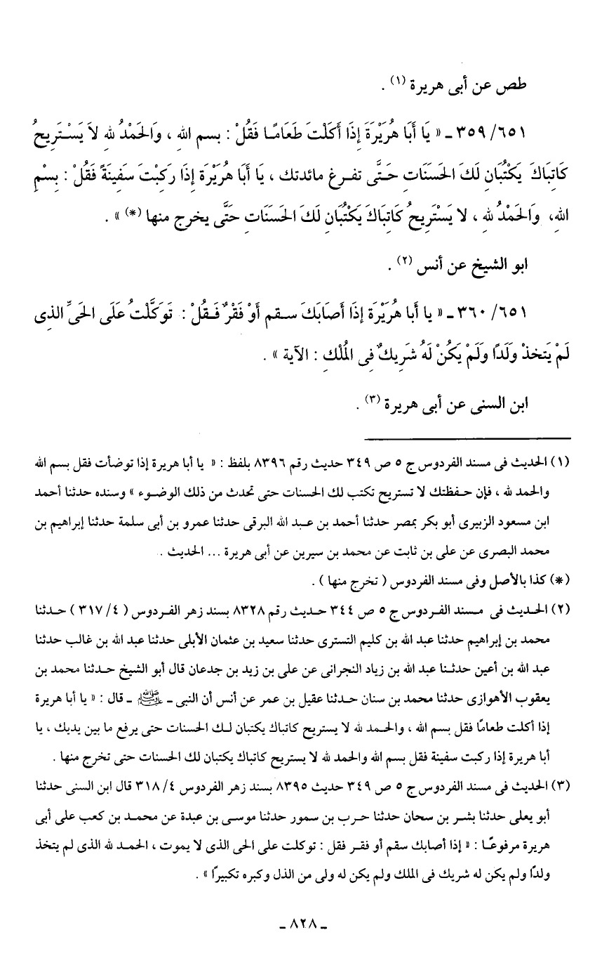 651/ 359 - "يَا أَبَا هُرَيْرَةَ إِذَا أَكَلْتَ طَعَامًا فَقُلْ: بسم اللهِ، وَالحَمْدُ للهِ لَا يَسْتَرِيحُ كَاتِبَاكَ يَكْتُبَانِ لَكَ الحَسَنَاتِ حَتَّى تفرغ مائدتك، يَا أَبَا هُرَيْرَة إِذَا رَكِبْتَ سَفِينَةً فَقُلْ: بِسْمِ اللهِ، وَالحَمْدُ للهِ، لا يَسْتَرِيحُ كَاتِبَاكَ يَكْتُبَانِ لَكَ الحَسَنَاتِ حَتَّى يخرج منها (*) ".