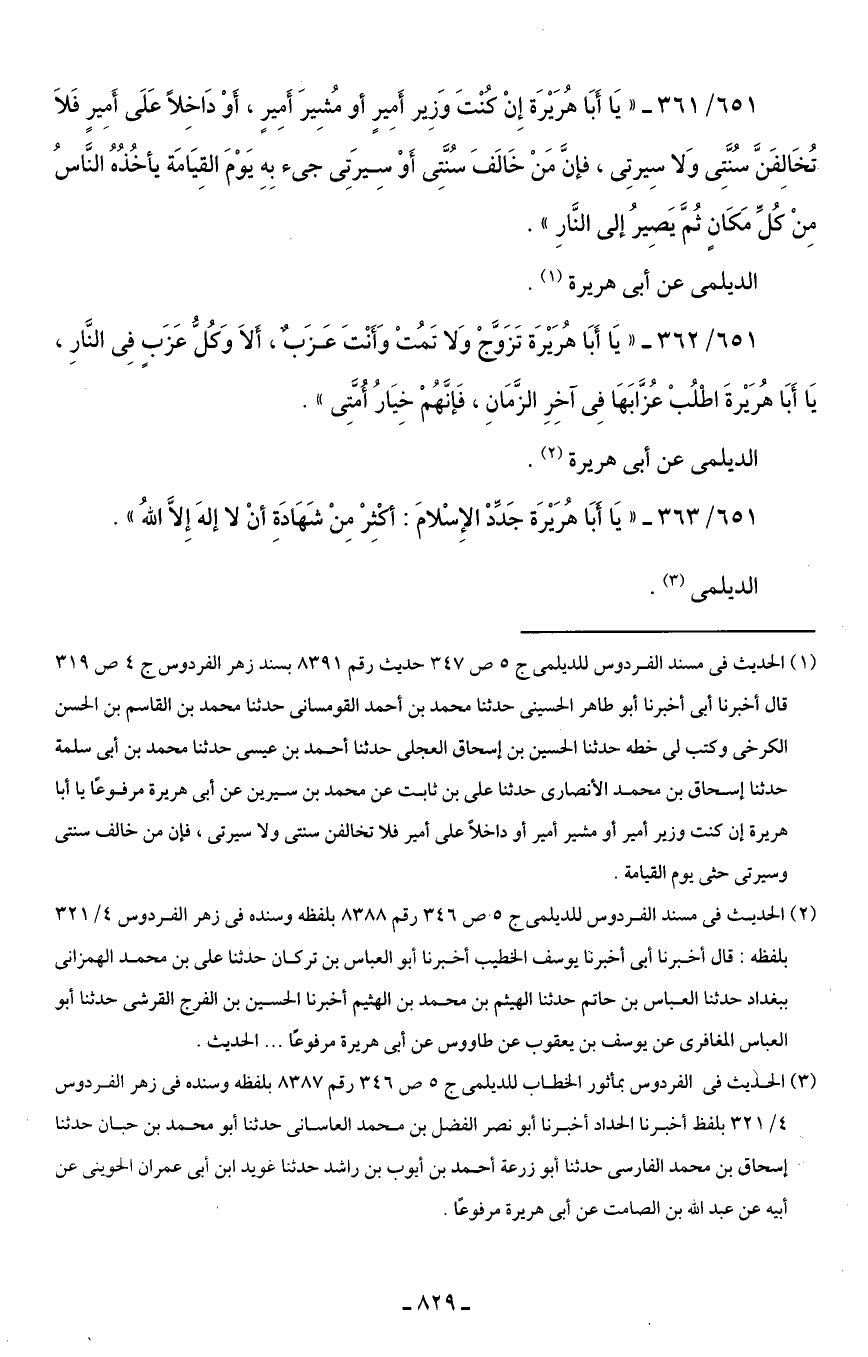 651/ 361 - "يَا أَبَا هُرَيْرَة إِنْ كُنْتَ وَزِير أَمِيرٍ أو مُشِيرَ أَمِيرٍ، أَوْ دَاخِلًا عَلَى أَمِيرٍ فَلَا تُخَالِفَنَّ سُنَّتِي وَلا سِيرتِي، فإنَّ مَنْ خَالَفَ سُنَّتِي أَوْ سِيرَتِي جيء بِهِ يَوْمَ القِيَامَة يأخُذُهُ النَّاسُ مِنْ كُلِّ مَكَانٍ ثُمَّ يَصِيرُ إلى النَّارِ".