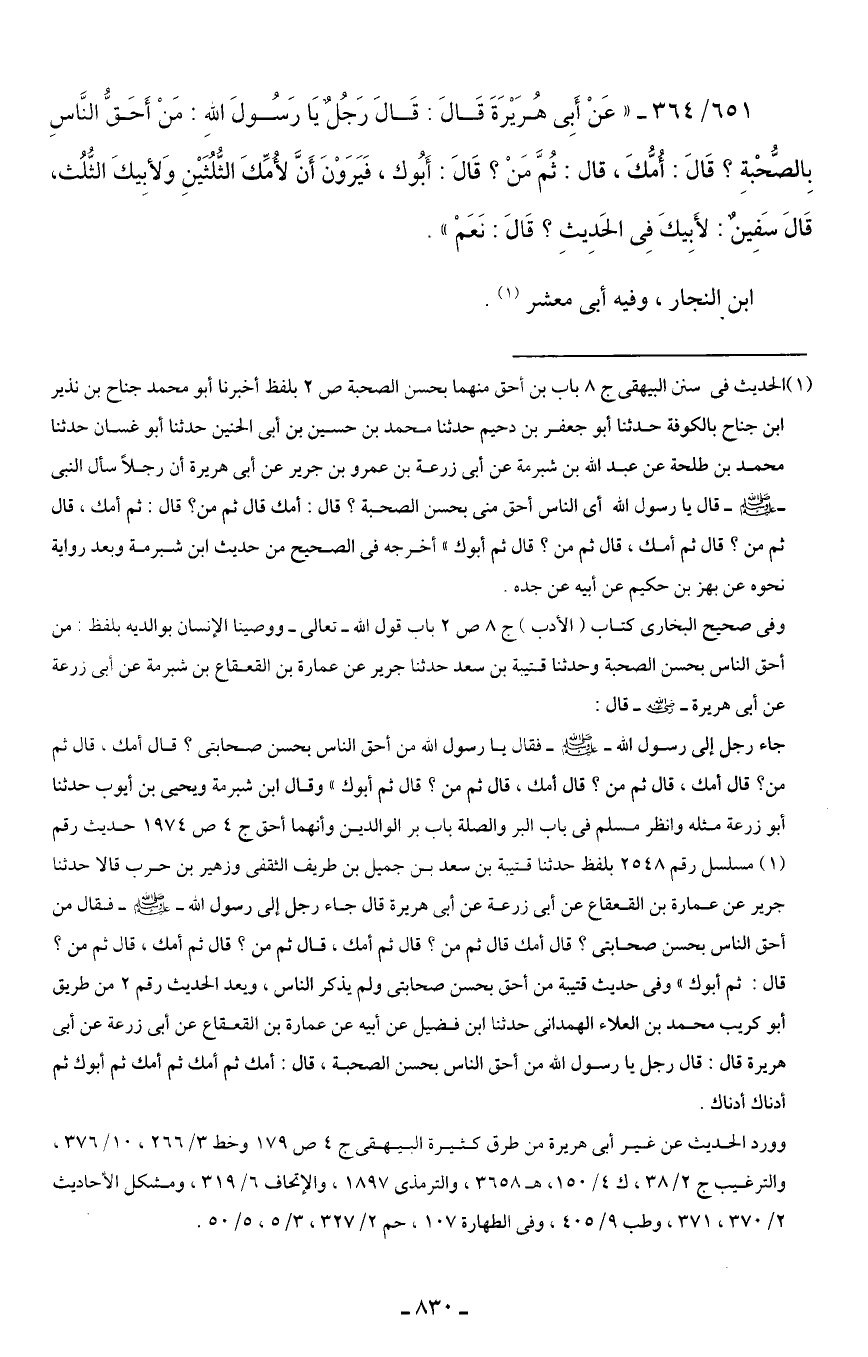 651/ 364 - "عَنْ أَبِي هُرَيْرَةَ قَالَ: قَالَ رَجُلٌ يَا رَسُولَ اللهِ: مَنْ أَحَقُّ النَّاسِ بِالصُّحْبةِ؟ قَالَ: أُمُّكَ، قال: ثُمَّ مَنْ؟ قَالَ: أَبُوك، فَيَرَوْنَ أَنَّ لأُمِّكَ الثُّلُثَيْنِ وَلأبِيكَ الثُّلُث، قَالَ سَفِينٌ: لأَبِيكَ فِي الحَدِيثِ؟ قَالَ: نَعَمْ".