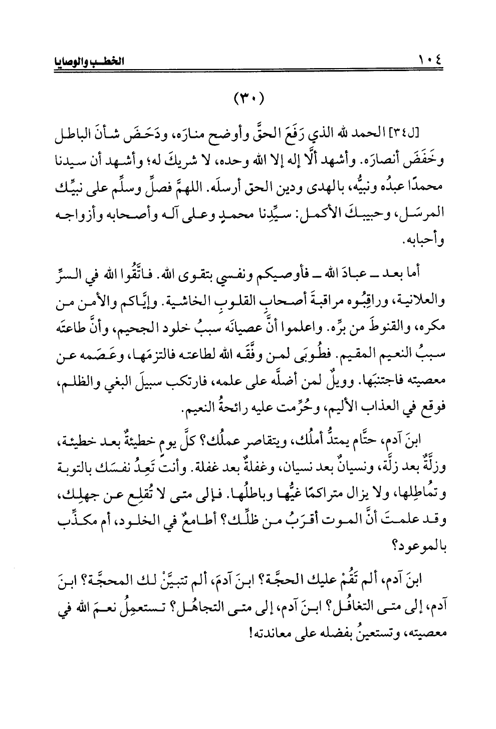 ابنَ آدم، ألم تَقُمْ عليك الحجَّة؟ ابنَ آدمَ، ألم تتبيَّنْ لك المحجَّة؟ ابنَ آدم، إلى متى التغافُل؟ ابنَ آدم، إلى متى التجاهُل؟ تستعمِلُ نعمَ الله في معصيته، وتستعينُ بفضله على معاندته!