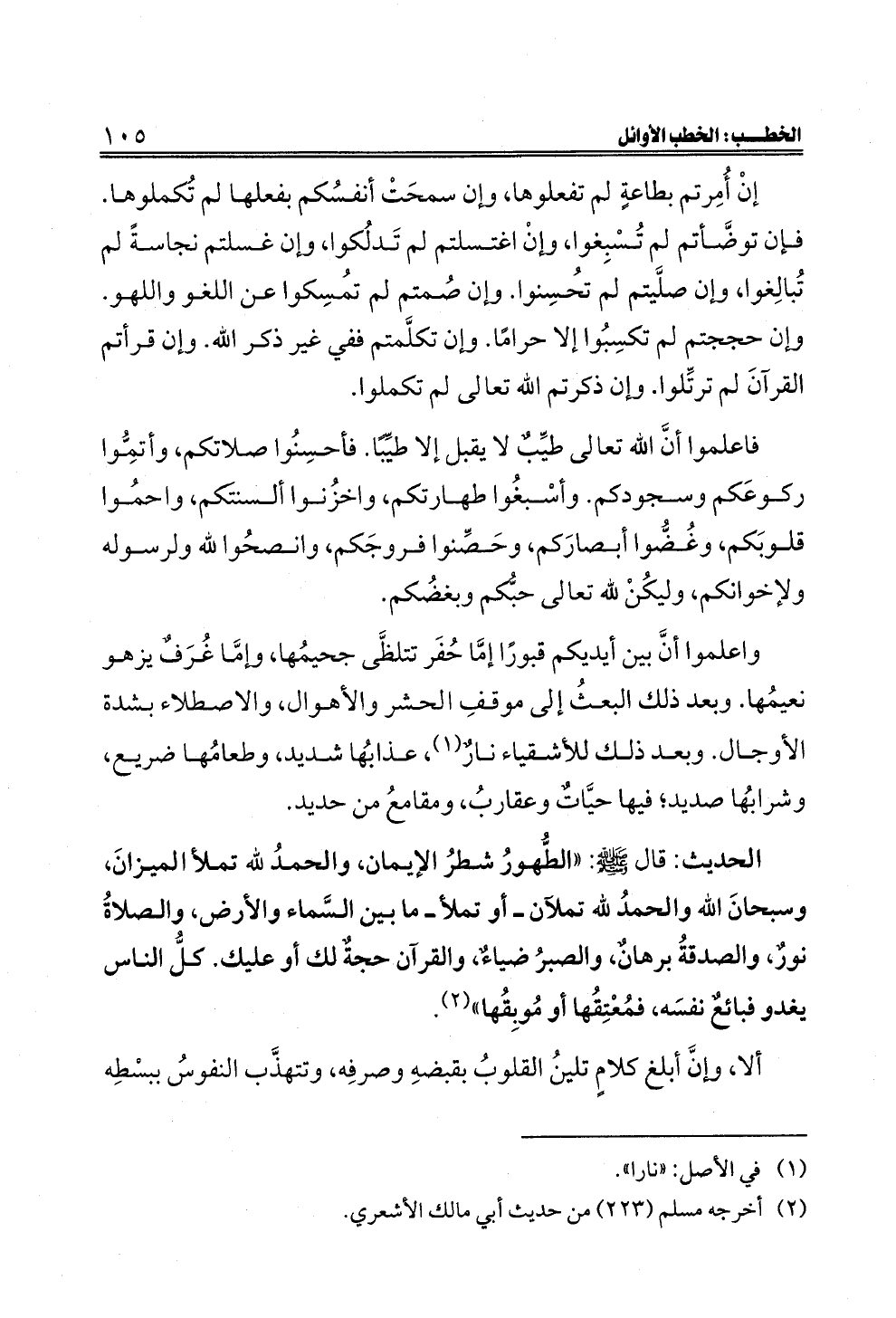 الحديث: قال - صلى الله عليه وسلم - : "الطُّهورُ شطرُ الإيمان، والحمدُ لله تملأ الميزانَ، وسبحانَ الله والحمدُ لله تملآن ــ أو تملأ ــ ما بين السَّماء والأرض، والصلاةُ نورٌ، والصدقةُ برهانٌ، والصبرُ ضياءٌ، والقرآن حجةٌ لك أو عليك. كلُّ الناس يغدو فبائعٌ نفسَه، فمُعْتِقُها أو مُوبِقُها" (¬٢).