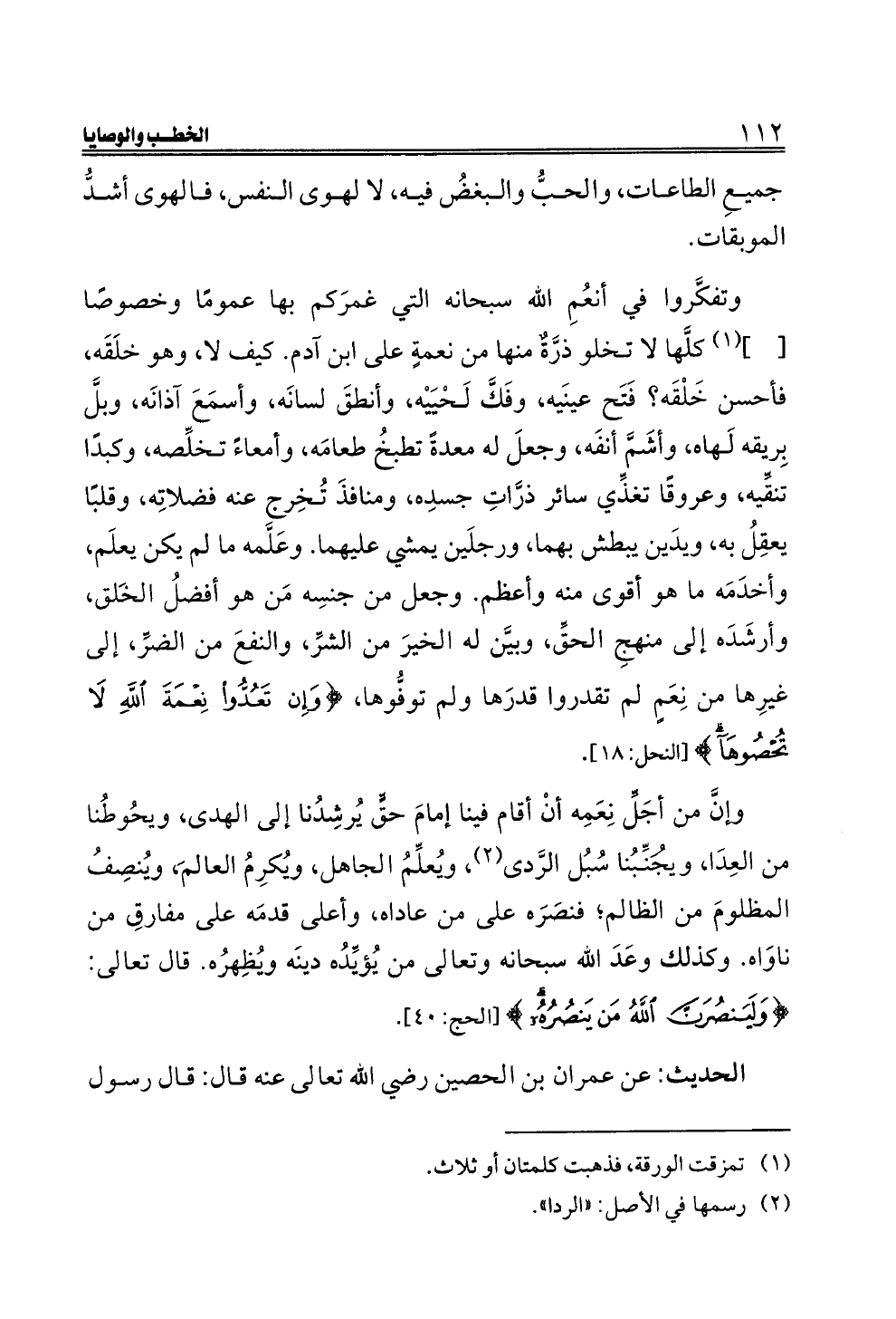 وتفكَّروا في أنعُمِ الله سبحانه التي غمرَكم بها عمومًا وخصوصًا [] (¬١) كلَّها لا تخلو ذرَّةٌ منها من نعمةٍ على ابن آدم. كيف لا، وهو خلَقَه، فأحسن خَلْقَه؟ فَتَح عينَيه، وفَكَّ لَحْيَيْه، وأنطقَ لسانَه، وأسمَعَ آذانَه، وبلَّ بِريقه لَهاه، وأشَمَّ أنفَه، وجعلَ له معدةً تطبخُ طعامَه، وأمعاءً تخلِّصه، وكبدًا تنقِّيه، وعروقًا تغذِّي سائر ذرَّاتِ جسدِه، ومنافذَ تُخِرج عنه فضلاتِه، وقلبًا يعقِلُ به، ويدَين يبطش بهما، ورجلَين يمشي عليهما. وعَلَّمه ما لم يكن يعلَم، وأخدَمَه ما هو أقوى منه وأعظم. وجعل من جنسِه مَن هو أفضلُ الخَلق، وأرشَدَه إلى منهجِ الحقِّ، وبيَّن له الخيرَ من الشرِّ، والنفعَ من الضرِّ، إلى غيرِها من نِعَمٍ لم تقدروا قدرَها ولم توفُّوها، {وَإِنْ تَعُدُّوا نِعْمَةَ اللَّهِ لَا تُحْصُوهَا} [النحل: ١٨].
