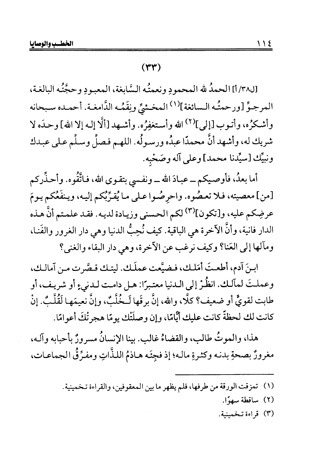 أما بعدُ، فأوصيكم ــ عبادَ الله ــ ونفسي بتقوى الله، فاتَّقُوه. وأحذِّركم [من] معصيته، فلا تعصُوه. واحرِصُوا على ما يُقرِّبُكم إليه، وينفَعُكم يومَ عرضِكم عليه، و [تكون] (¬٣) لكم الحسنى وزيادة لديه. فقد علمتم أنَّ هذه الدار فانية، وأنَّ الآخرة هي الباقية. كيف نُحِبُّ الدنيا وهي دار الغرور والفَنا، ومآلها إلى العَنا؟ وكيف نرغب عن الآخرة، وهي دار البقاء والغنى؟