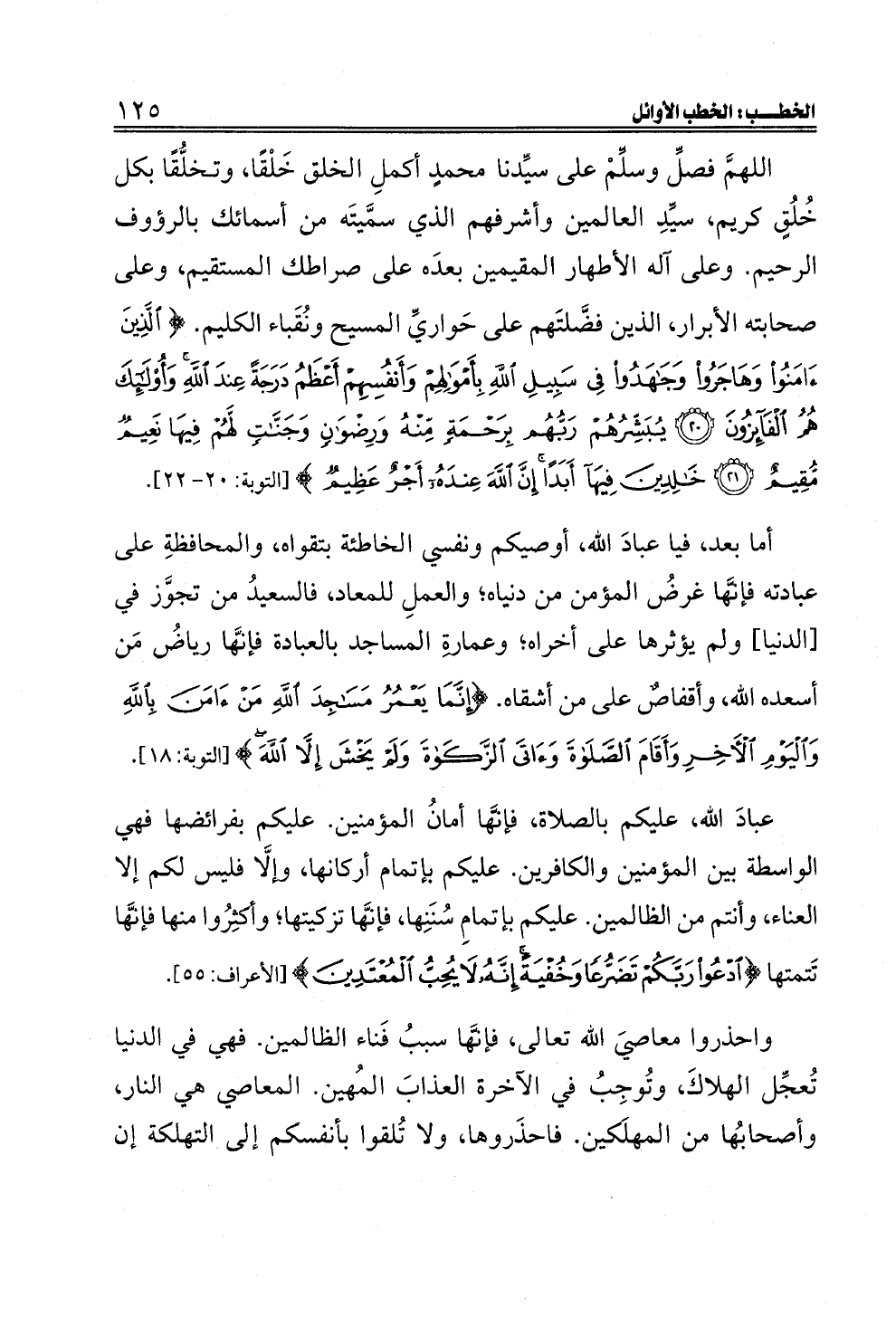 اللهمَّ فصلِّ وسلِّمْ على سيِّدنا محمدٍ أكملِ الخلق خَلْقًا، وتخلُّقًا بكل خُلُقٍ كريم، سيِّدِ العالمين وأشرفهم الذي سمَّيتَه من أسمائك بالرؤوف الرحيم. وعلى آله الأطهار المقيمين بعدَه على صراطك المستقيم، وعلى صحابته الأبرار، الذين فضَّلتَهم على حَواريِّ المسيح ونُقَباء الكليم. {الَّذِينَ آمَنُوا وَهَاجَرُوا وَجَاهَدُوا فِي سَبِيلِ اللَّهِ بِأَمْوَالِهِمْ وَأَنْفُسِهِمْ أَعْظَمُ دَرَجَةً عِنْدَ اللَّهِ وَأُولَئِكَ هُمُ الْفَائِزُونَ (٢٠) يُبَشِّرُهُمْ رَبُّهُمْ بِرَحْمَةٍ مِنْهُ وَرِضْوَانٍ وَجَنَّاتٍ لَهُمْ فِيهَا نَعِيمٌ مُقِيمٌ (٢١) خَالِدِينَ فِيهَا أَبَدًا إِنَّ اللَّهَ عِنْدَهُ أَجْرٌ عَظِيمٌ} [التوبة: ٢٠ - ٢٢].
