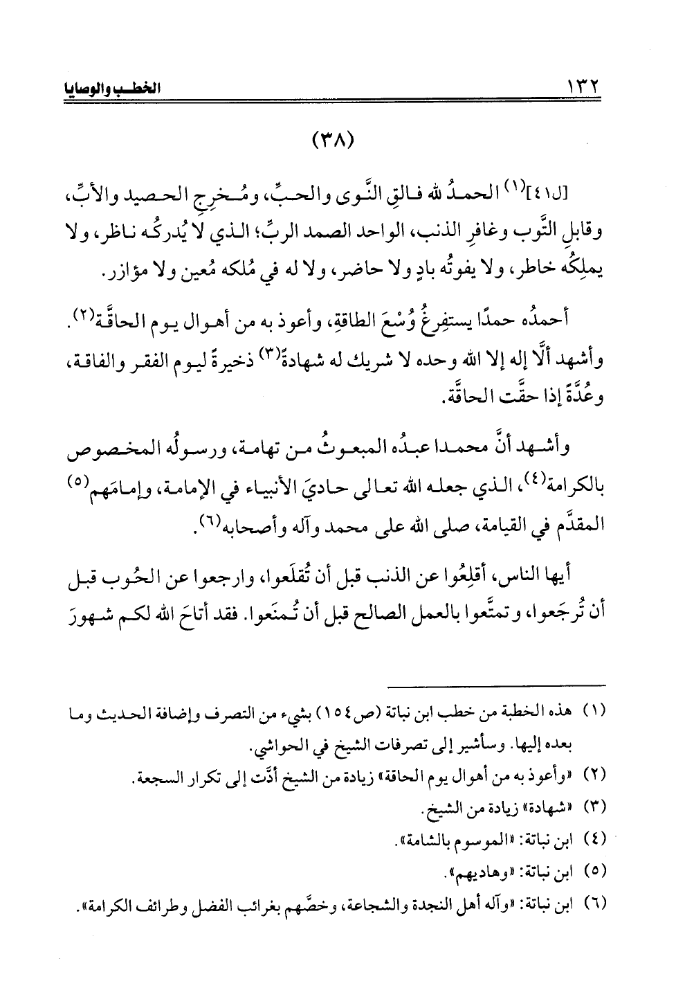 (¬١) هذه الخطبة من خطب ابن نباتة (ص ١٥٤) بشيء من التصرف وإضافة الحديث وما بعده إليها. وسأشير إلى تصرفات الشيخ في الحواشي.