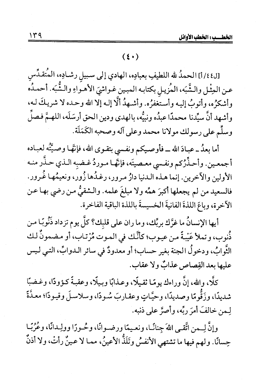 أما بعدُ ــ عبادَ الله ــ فأوصيكم ونفسي بتقوى الله، فإنَّها وصيَّتُه لعباده أجمعين. وأحذِّرُكم ونفسي معصيتَه، فإنَّها موردُ غضبِه الذي حذَّر منه الأولين والآخرين. إنما هذه الدنيا دارُ مرور، رغدُها زُور، ونعيمُها غُرور. فالسعيد من لم يجعلها أكبرَ همِّه ولا مبلغَ علمه. والشقيُّ من رضي بها عن الآخرة، وباعَ اللذةَ الفانيةَ الخسيسةَ باللذة الباقية الفاخرة.