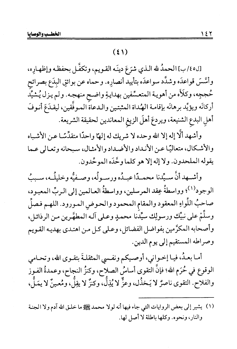 [ل ٤٥/ب] الحمدُ لله الذي شرَعَ دينَه القويم، وتكفَّل بحفظه وإظهارِه، وأسَّسَ قواعدَه وشدَّد سواعدَه بتأييد أنصارِه. وحماه عن بوائقِ البِدَع بصرائحِ حُججِه، وكلَأَه من أهوية المتعسِّفين بهدايةِ واضحِ منهجه. ولم يزل يُشيِّد أركانَه ويؤيِّد برهانَه بإقامة الهُداة المثبتين والدعاة الموفَّقين، ليقدَعَ أنوفَ أهلِ البدعِ الشنيعة، ويردعَ أهلَ الزيغِ المعاندين لحقيقة الشريعة.