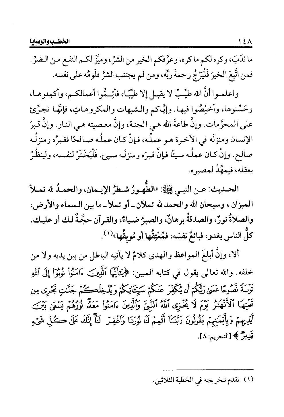 واعلموا أنَّ الله طيِّبٌ لا يقبل إلا طيِّبًا، فأتِمُّوا أعمالكم، وأكمِلوها، وحَسِّنوها، وأخلِصُوا فيها. وإيَّاكم والشبهات والمكروهاتِ، فإنَّها تجرِّئ على المحرَّمات. وإنَّ طاعةَ الله هي الجنة، وإنَّ معصيته هي النار. وإنَّ قبرَ الإنسان ومنزلَه في الآخرة هو عملُه، فإنْ كان عملُه صالحًا فقبرُه ومنزلُه صالح. وإنْ كان عملُه سيئًا فإنَّ قبرَه ومنزلَه سيئ. فَلْيَخَتَرْ لنفسه، ولينظُرْ بعقله، فيمهِّدْ لمصيره.