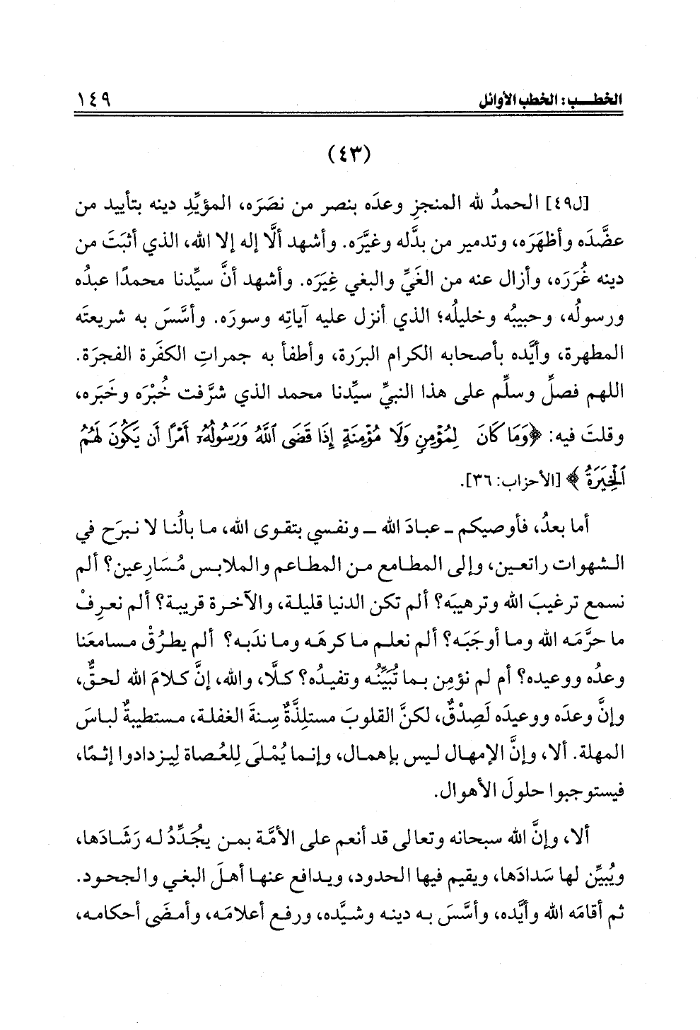 [ل ٤٩] الحمدُ لله المنجزِ وعدَه بنصر من نصَرَه، المؤيِّدِ دينه بتأييد من عضَّدَه وأظهَرَه، وتدمير من بدَّله وغيَّرَه. وأشهد ألَّا إله إلا الله، الذي أثبَتَ من دينه غُرَرَه، وأزال عنه من الغَيِّ والبغي غِيَرَه. وأشهد أنَّ سيِّدنا محمدًا عبدُه ورسولُه، وحبيبُه وخليلُه؛ الذي أنزل عليه آياتِه وسورَه. وأسَّسَ به شريعتَه المطهرة، وأيَّده بأصحابه الكرام البرَرة، وأطفأ به جمراتِ الكفَرة الفجرَة. اللهم فصلِّ وسلِّم على هذا النبيِّ سيِّدنا محمد الذي شرَّفت خُبْرَه وخَبَره، وقلتَ فيه: {وَمَا كَانَ لِمُؤْمِنٍ وَلَا مُؤْمِنَةٍ إِذَا قَضَى اللَّهُ وَرَسُولُهُ أَمْرًا أَنْ يَكُونَ لَهُمُ الْخِيَرَةُ} [الأحزاب: ٣٦].