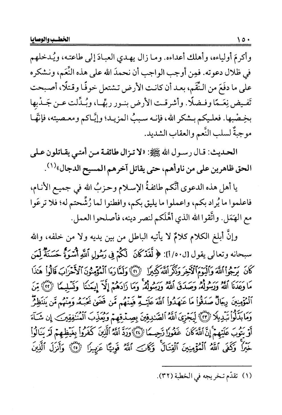 وإنَّ أبلغ الكلام كلامٌ لا يأتيه الباطل من بين يديه ولا من خلفه، والله سبحانه وتعالى يقول [ل ٥٠/أ]: {لَقَدْ كَانَ لَكُمْ فِي رَسُولِ اللَّهِ أُسْوَةٌ حَسَنَةٌ لِمَنْ كَانَ يَرْجُو اللَّهَ وَالْيَوْمَ الْآخِرَ وَذَكَرَ اللَّهَ كَثِيرًا (٢١) وَلَمَّا رَأَى الْمُؤْمِنُونَ الْأَحْزَابَ قَالُوا هَذَا مَا وَعَدَنَا اللَّهُ وَرَسُولُهُ وَصَدَقَ اللَّهُ وَرَسُولُهُ وَمَا زَادَهُمْ إِلَّا إِيمَانًا وَتَسْلِيمًا (٢٢) مِنَ الْمُؤْمِنِينَ رِجَالٌ صَدَقُوا مَا عَاهَدُوا اللَّهَ عَلَيْهِ فَمِنْهُمْ مَنْ قَضَى نَحْبَهُ وَمِنْهُمْ مَنْ يَنْتَظِرُ وَمَا بَدَّلُوا تَبْدِيلًا (٢٣) لِيَجْزِيَ اللَّهُ الصَّادِقِينَ بِصِدْقِهِمْ وَيُعَذِّبَ الْمُنَافِقِينَ إِنْ شَاءَ أَوْ يَتُوبَ عَلَيْهِمْ إِنَّ اللَّهَ كَانَ غَفُورًا رَحِيمًا (٢٤) وَرَدَّ اللَّهُ الَّذِينَ كَفَرُوا بِغَيْظِهِمْ لَمْ يَنَالُوا خَيْرًا وَكَفَى اللَّهُ الْمُؤْمِنِينَ الْقِتَالَ وَكَانَ اللَّهُ قَوِيًّا عَزِيزًا (٢٥) وَأَنْزَلَ الَّذِينَ