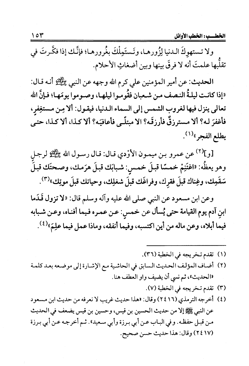 (¬٤) أخرجه الترمذي (٢٤١٦) وقال: "هذا حديث غريب لا نعرفه من حديث ابن مسعود عن النبي - صلى الله عليه وسلم - إلا من حديث الحسين بن قيس، وحسين بن قيس يضعف في الحديث من قبل حفظه. وفي الباب عن أبي برزة وأبي سعيد". ثم أخرجه عن أبي برزة (٢٤١٧) وقال: هذا حديث حسن صحيح.
