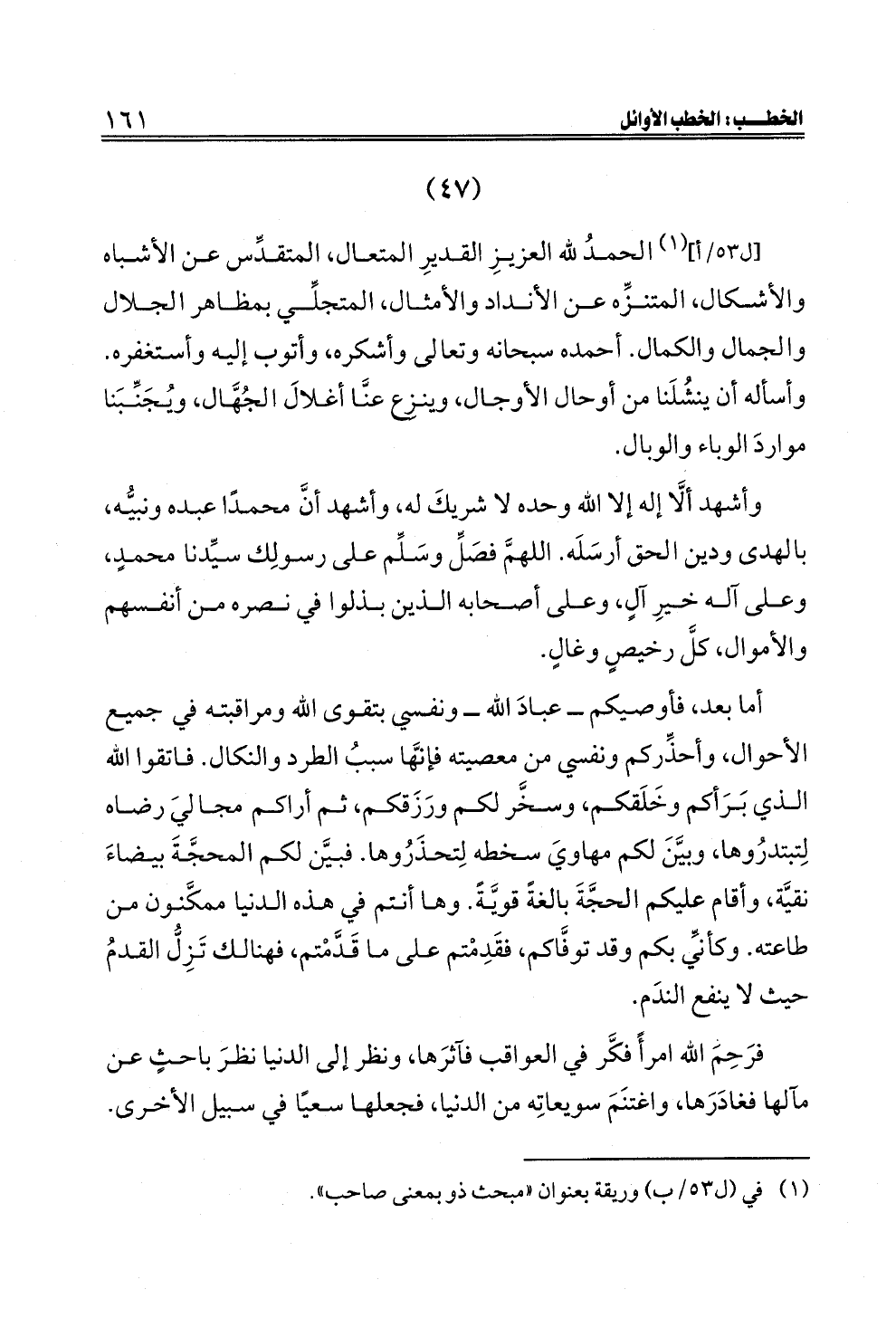 أما بعد، فأوصيكم ــ عبادَ الله ــ ونفسي بتقوى الله ومراقبته في جميع الأحوال، وأحذِّركم ونفسي من معصيته فإنَّها سببُ الطرد والنكال. فاتقوا الله الذي بَرَأكم وخَلَقكم، وسخَّر لكم ورَزَقكم، ثم أراكم مجاليَ رضاه لِتبتدرُوها، وبيَّنَ لكم مهاويَ سخطه لِتحذَرُوها. فبيَّن لكم المحجَّةَ بيضاءَ نقيَّة، وأقام عليكم الحجَّةَ بالغةً قويَّةً. وها أنتم في هذه الدنيا ممكَّنون من طاعته. وكأنِّي بكم وقد توفَّاكم، فقَدِمْتم على ما قَدَّمْتم، فهنالك تَزِلُّ القدمُ حيث لا ينفع الندَم.