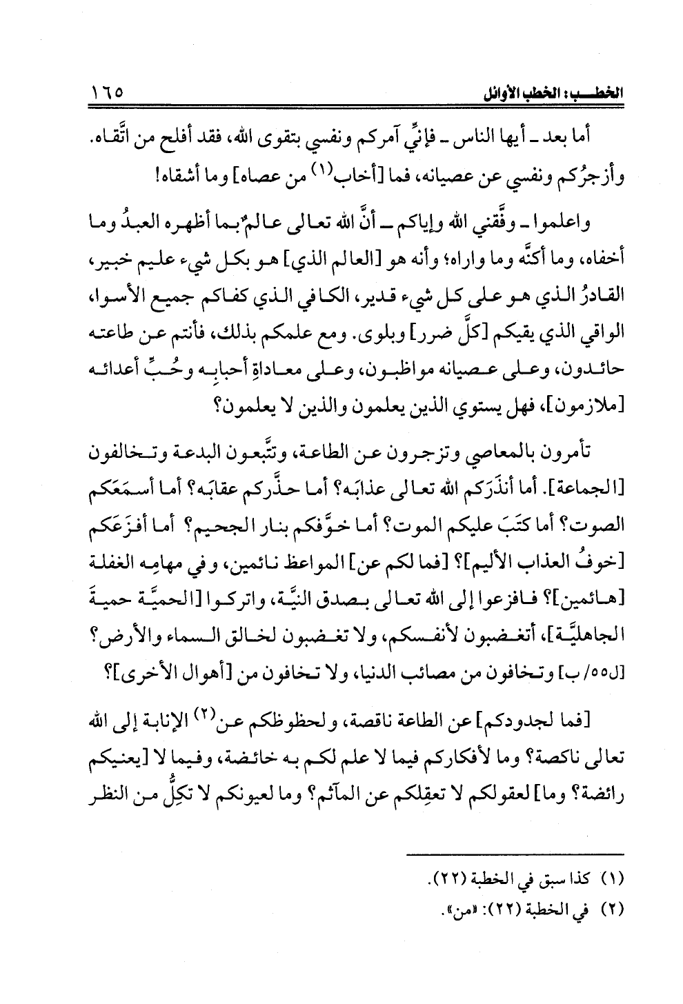 تأمرون بالمعاصي وتزجرون عن الطاعة، وتتَّبعون البدعة وتخالفون [الجماعة]. أما أنذَرَكم الله تعالى عذابَه؟ أما حذَّركم عقابَه؟ أما أسمَعَكم الصوت؟ أما كتَبَ عليكم الموت؟ أما خوَّفكم بنار الجحيم؟ أما أفزَعَكم [خوفُ العذاب الأليم]؟ [فما لكم عن] المواعظ نائمين، وفي مهامِه الغفلة [هائمين]؟ فافزعوا إلى الله تعالى بصدق النيَّة، واتركوا [الحميَّة حميةَ الجاهليَّة]، أتغضبون لأنفسكم، ولا تغضبون لخالق السماء والأرض؟ [ل ٥٥/ب] وتخافون من مصائب الدنيا، ولا تخافون من [أهوال الأخرى]؟