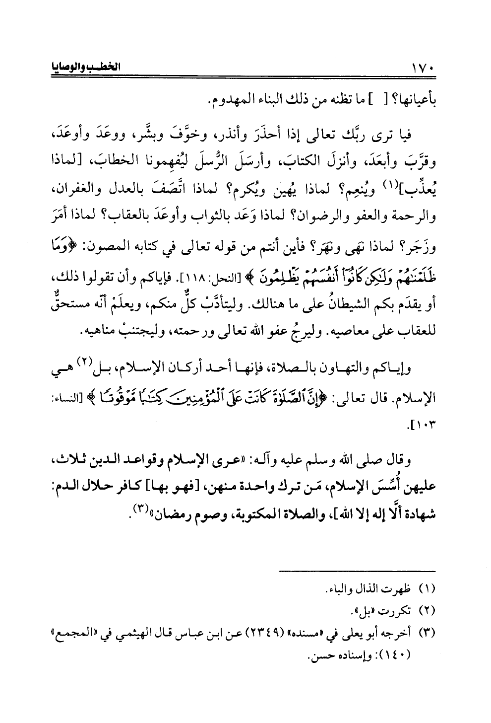 وإياكم والتهاون بالصلاة، فإنها أحد أركان الإسلام، بل (¬٢) هي الإسلام. قال تعالى: {إِنَّ الصَّلَاةَ كَانَتْ عَلَى الْمُؤْمِنِينَ كِتَابًا مَوْقُوتًا} [النساء: ١٠٣].