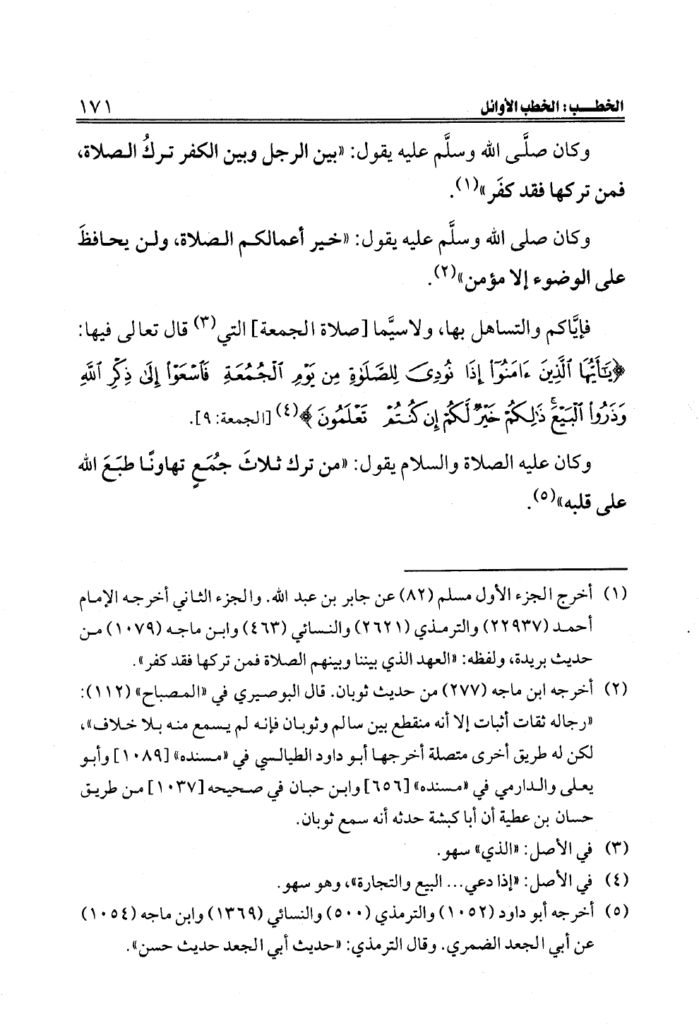 فإيَّاكم والتساهل بها، ولاسيَّما [صلاة الجمعة] التي (¬٣) قال تعالى فيها: {يَاأَيُّهَا الَّذِينَ آمَنُوا إِذَا نُودِيَ لِلصَّلَاةِ مِنْ يَوْمِ الْجُمُعَةِ فَاسْعَوْا إِلَى ذِكْرِ اللَّهِ وَذَرُوا الْبَيْعَ ذَلِكُمْ خَيْرٌ لَكُمْ إِنْ كُنْتُمْ تَعْلَمُونَ} (¬٤) [الجمعة: ٩].