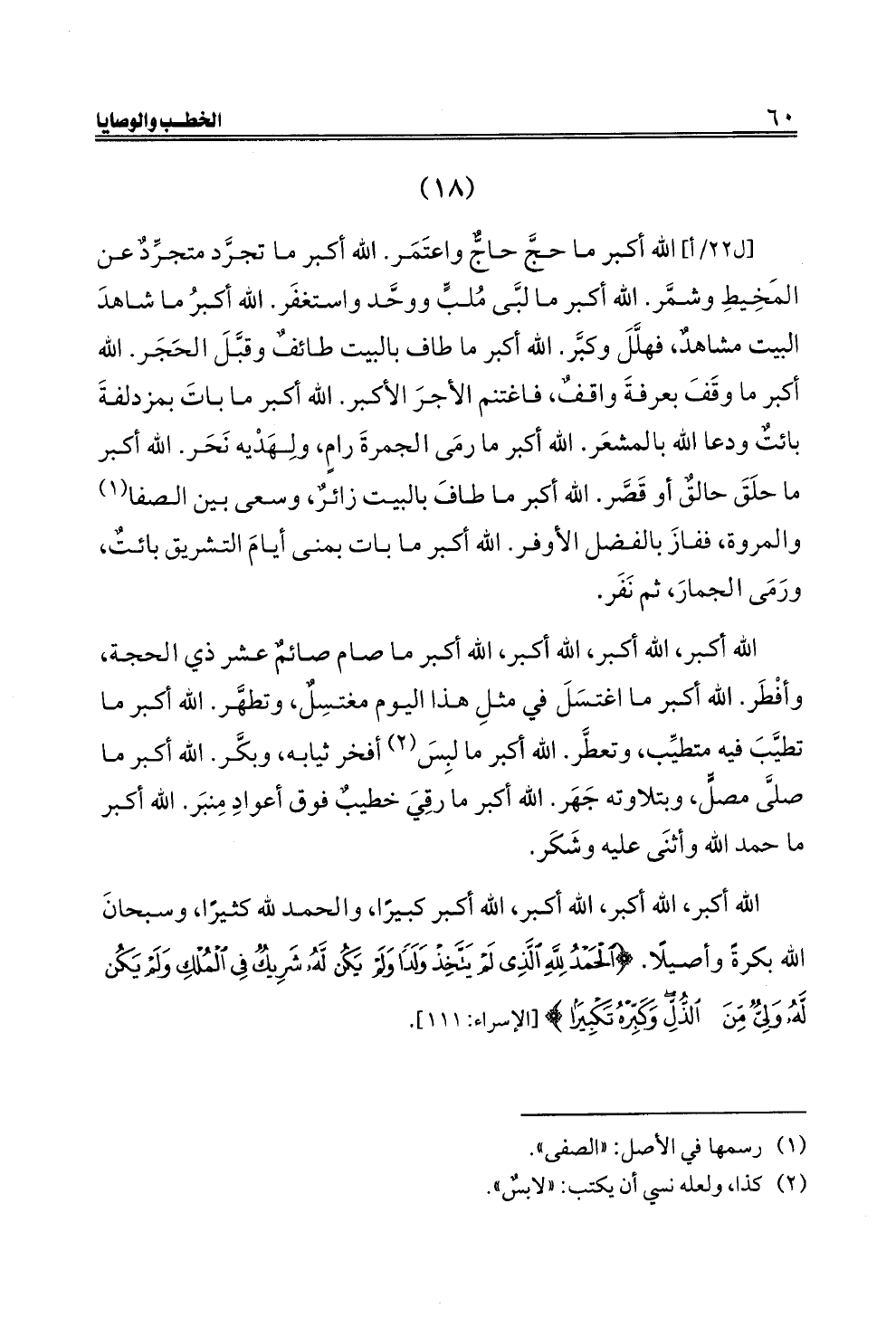الله أكبر، الله أكبر، الله أكبر، الله أكبر ما صام صائمٌ عشر ذي الحجة، وأفْطَر. الله أكبر ما اغتسَلَ في مثلِ هذا اليوم مغتسِلٌ، وتطهَّر. الله أكبر ما تطيَّبَ فيه متطيِّب، وتعطَّر. الله أكبر ما لبِسَ (¬٢) أفخر ثيابه، وبكَّر. الله أكبر ما صلَّى مصلٍّ، وبتلاوته جَهَر. الله أكبر ما رقِيَ خطيبٌ فوق أعوادِ مِنبَر. الله أكبر ما حمد الله وأثنَى عليه وشَكَر.