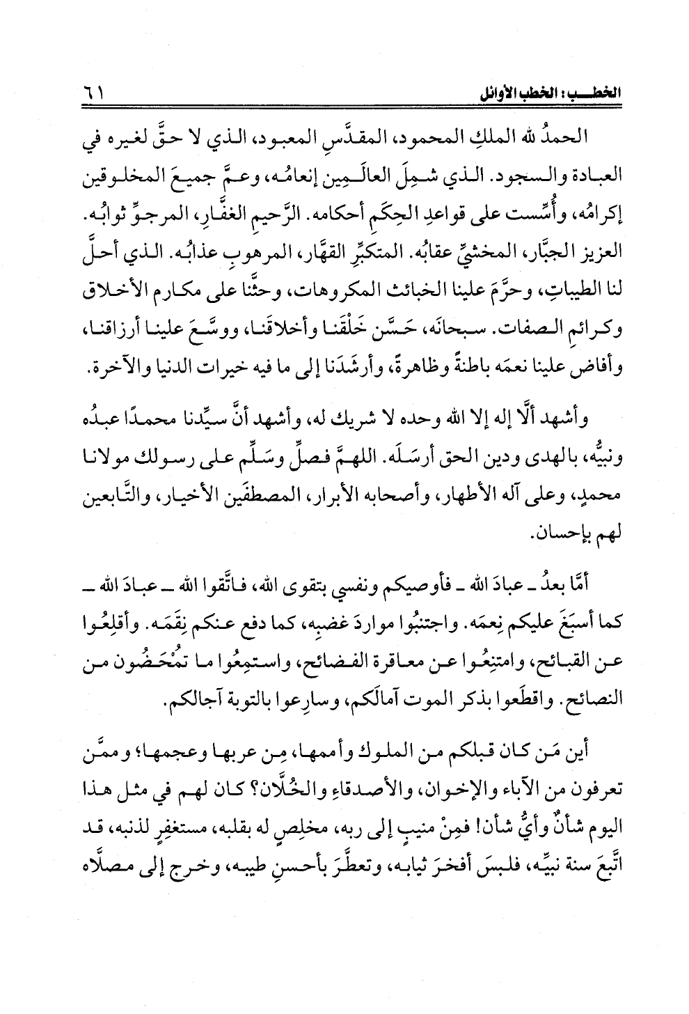 أمَّا بعدُ ــ عبادَ الله ــ فأوصيكم ونفسي بتقوى الله، فاتَّقوا الله ــ عبادَ الله ــ كما أسبَغَ عليكم نِعمَه. واجتنبُوا مواردَ غضبِه، كما دفع عنكم نِقَمَه. وأقلِعُوا عن القبائح، وامتنِعُوا عن معاقرة الفضائح، واستمِعُوا ما تُمْحَضُون من النصائح. واقطَعوا بذكر الموت آمالَكم، وسارِعوا بالتوبة آجالكم.