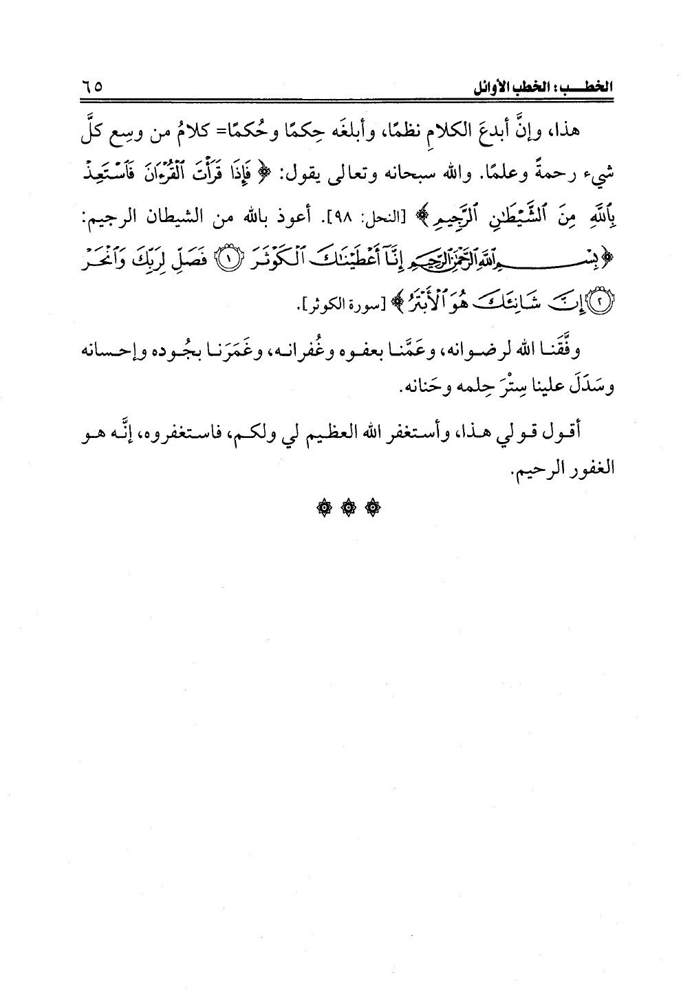 هذا، وإنَّ أبدعَ الكلامِ نظمًا، وأبلغَه حِكمًا وحُكمًا= كلامُ من وسِع كلَّ شيء رحمةً وعلمًا. والله سبحانه وتعالى يقول: {فَإِذَا قَرَأْتَ الْقُرْآنَ فَاسْتَعِذْ بِاللَّهِ مِنَ الشَّيْطَانِ الرَّجِيمِ} [النحل: ٩٨]. أعوذ بالله من الشيطان الرجيم: {بِسْمِ اللَّهِ الرَّحْمَنِ الرَّحِيمِ إِنَّا أَعْطَيْنَاكَ الْكَوْثَرَ (١) فَصَلِّ لِرَبِّكَ وَانْحَرْ (٢) إِنَّ شَانِئَكَ هُوَ الْأَبْتَرُ} [سورة الكوثر].