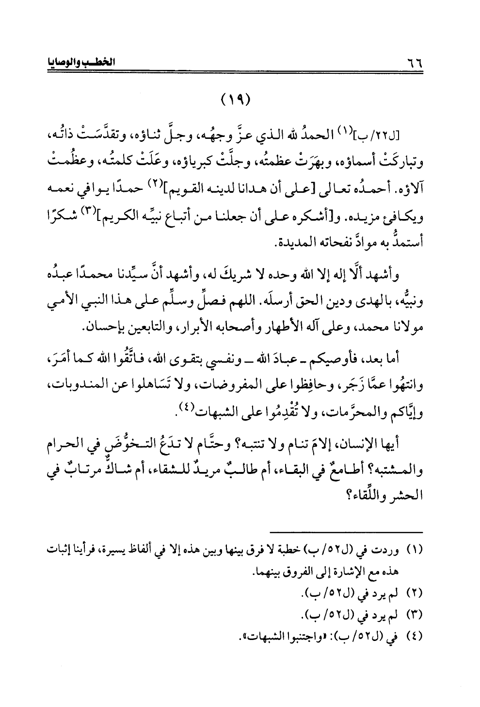 (¬١) وردت في (ل ٥٢/ب) خطبة لا فرق بينها وبين هذه إلا في ألفاظ يسيرة، فرأينا إثبات هذه مع الإشارة إلى الفروق بينهما.