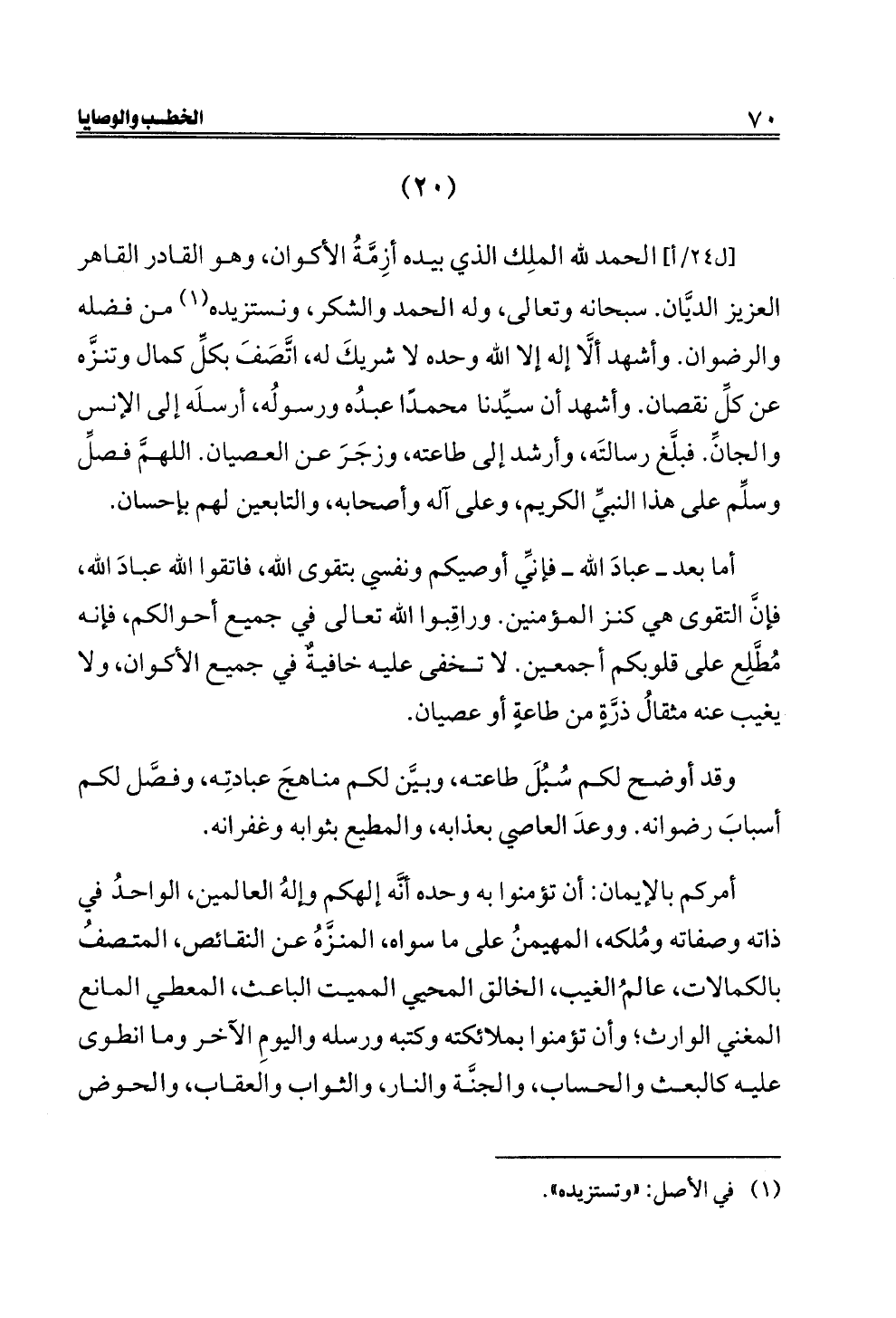 [ل ٢٤/أ] الحمد لله الملِك الذي بيده أزِمَّةُ الأكوان، وهو القادر القاهر العزيز الديَّان. سبحانه وتعالى، وله الحمد والشكر، ونستزيده (¬١) من فضله والرضوان. وأشهد ألَّا إله إلا الله وحده لا شريكَ له، اتَّصَفَ بكلِّ كمال وتنزَّه عن كلِّ نقصان. وأشهد أن سيِّدنا محمدًا عبدُه ورسولُه، أرسلَه إلى الإنس والجانِّ. فبلَّغ رسالتَه، وأرشد إلى طاعته، وزجَرَ عن العصيان. اللهمَّ فصلِّ وسلِّم على هذا النبيِّ الكريم، وعلى آله وأصحابه، والتابعين لهم بإحسان.