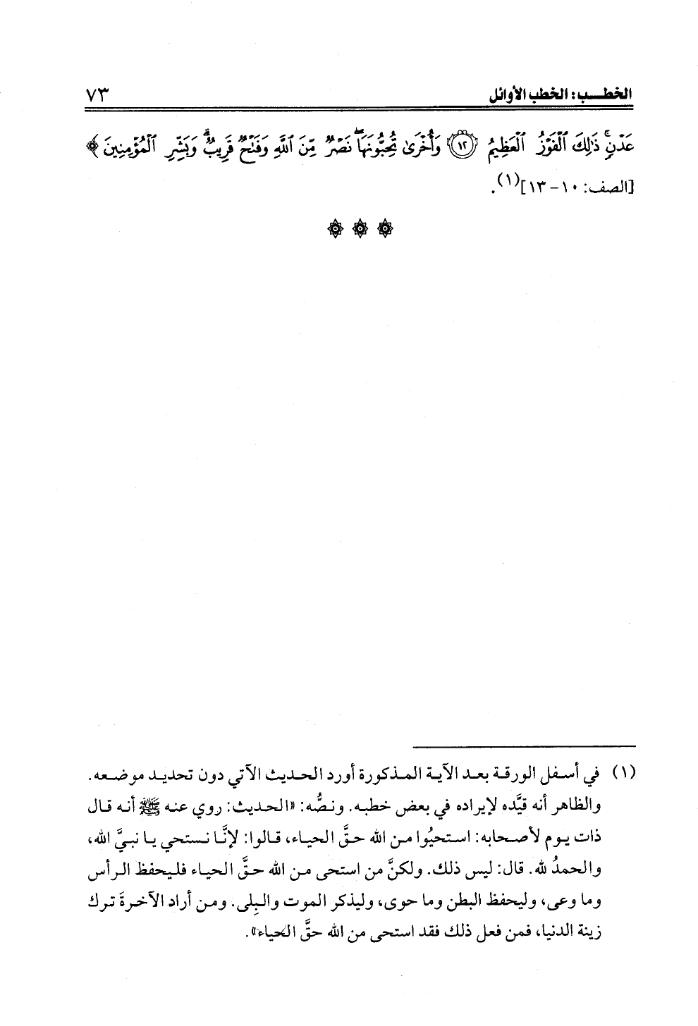 (¬١) في أسفل الورقة بعد الآية المذكورة أورد الحديث الآتي دون تحديد موضعه. والظاهر أنه قيَّده لإيراده في بعض خطبه. ونصُّه: "الحديث: روي عنه - صلى الله عليه وسلم - أنه قال ذات يوم لأصحابه: استحيُوا من الله حقَّ الحياء، قالوا: لإنَّا نستحي يا نبيَّ الله، والحمدُ لله. قال: ليس ذلك. ولكنَّ من استحى من الله حقَّ الحياء فليحفظ الرأس وما وعى، وليحفظ البطن وما حوى، وليذكر الموت والبِلى. ومن أراد الآخرةَ ترك زينة الدنيا، فمن فعل ذلك فقد استحى من الله حقَّ الحياء".