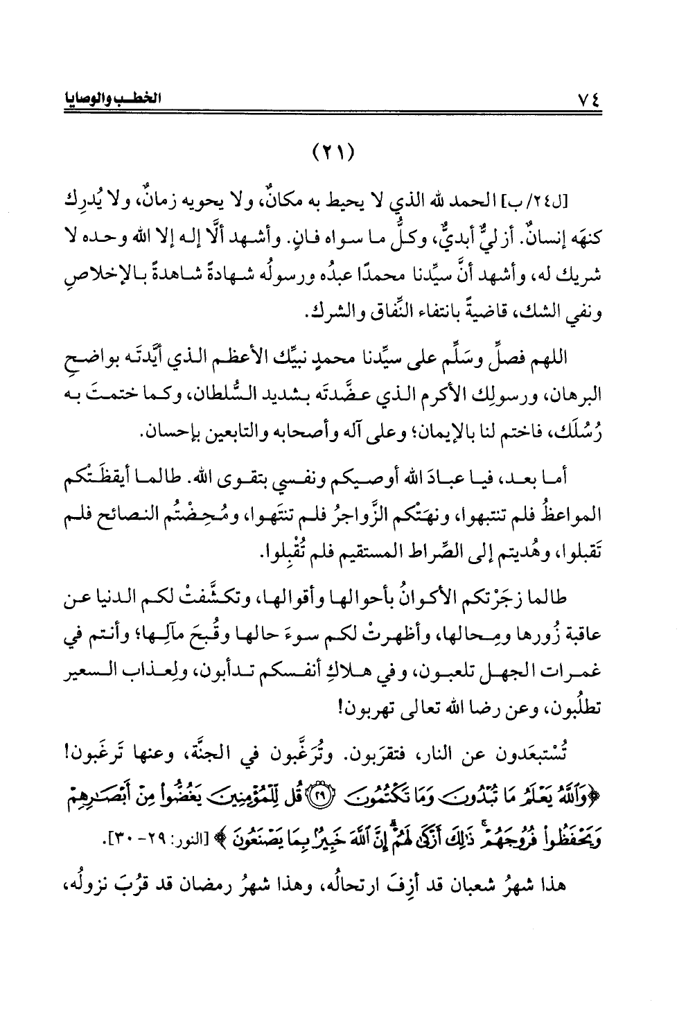 [ل ٢٤/ب] الحمد لله الذي لا يحيط به مكانٌ، ولا يحويه زمانٌ، ولا يُدرِك كنهَه إنسانٌ. أزليٌّ أبديٌّ، وكلُّ ما سواه فانٍ. وأشهد ألَّا إله إلا الله وحده لا شريك له، وأشهد أنَّ سيِّدنا محمدًا عبدُه ورسولُه شهادةً شاهدةً بالإخلاصِ ونفي الشك، قاضيةً بانتفاء النِّفاق والشرك.