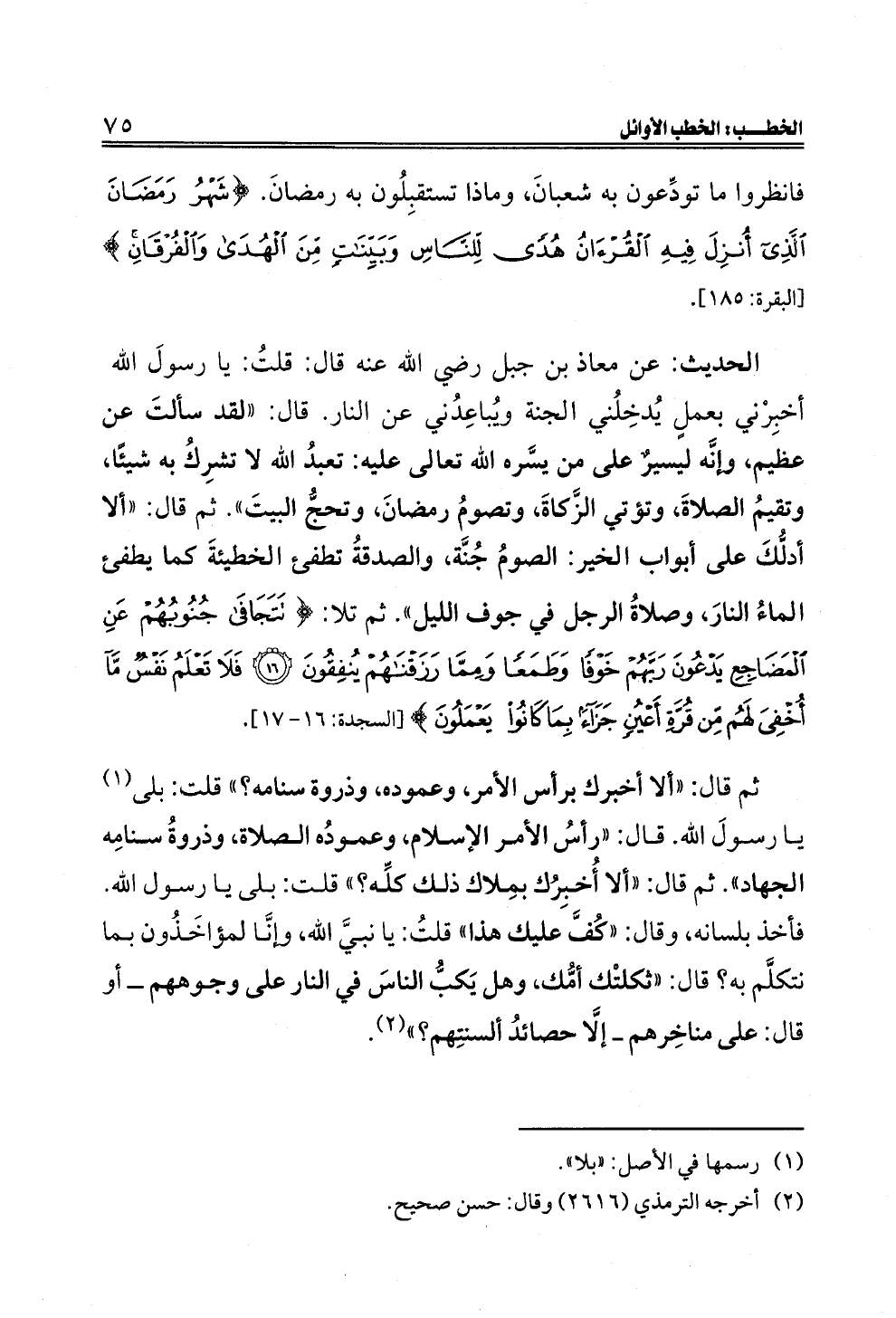 ثم قال: "ألا أخبرك برأس الأمر، وعموده، وذروة سنامه؟ " قلت: بلى (¬١) يا رسولَ الله. قال: "رأسُ الأمر الإسلام، وعمودُه الصلاة، وذروةُ سنامِه الجهاد". ثم قال: "ألا أُخبِرُك بمِلاك ذلك كلِّه؟ " قلت: بلى يا رسول الله. فأخذ بلسانه، وقال: "كُفَّ عليك هذا" قلتُ: يا نبيَّ الله، وإنَّا لمؤاخَذُون بما نتكلَّم به؟ قال: "ثكلتْك أمُّك، وهل يَكبُّ الناسَ في النار على وجوههم ــ أو قال: على مناخِرهم ــ إلَّا حصائدُ ألسنتِهم؟ " (¬٢).
