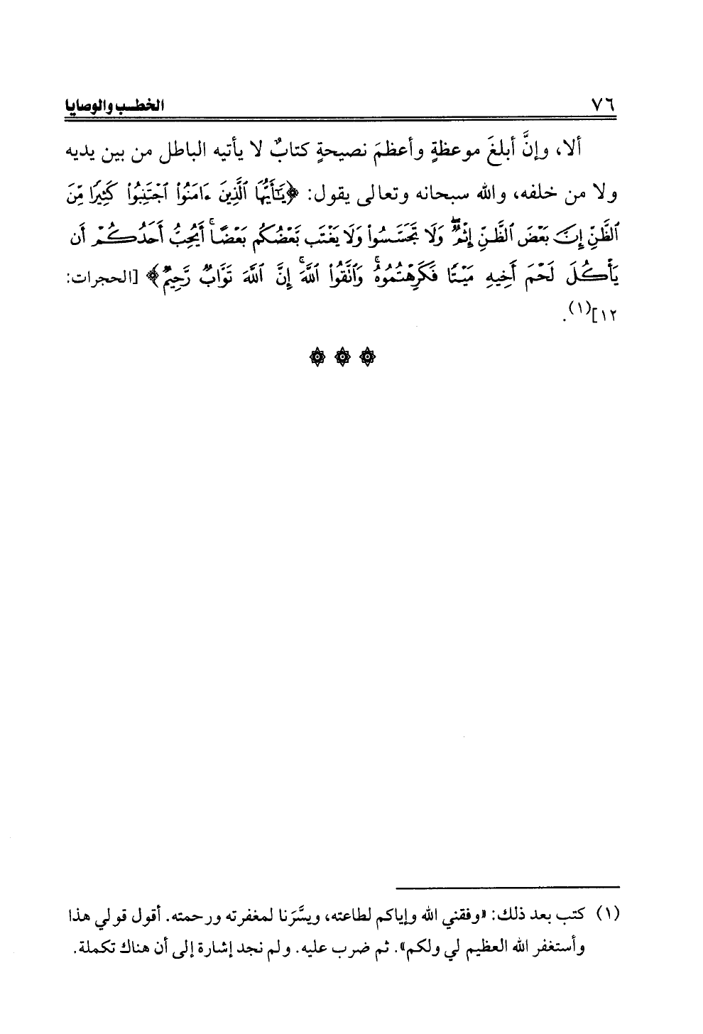 ألا، وإنَّ أبلغَ موعظةٍ وأعظمَ نصيحةٍ كتابٌ لا يأتيه الباطل من بين يديه ولا من خلفه، والله سبحانه وتعالى يقول: {يَاأَيُّهَا الَّذِينَ آمَنُوا اجْتَنِبُوا كَثِيرًا مِنَ الظَّنِّ إِنَّ بَعْضَ الظَّنِّ إِثْمٌ وَلَا تَجَسَّسُوا وَلَا يَغْتَبْ بَعْضُكُمْ بَعْضًا أَيُحِبُّ أَحَدُكُمْ أَنْ يَأْكُلَ لَحْمَ أَخِيهِ مَيْتًا فَكَرِهْتُمُوهُ وَاتَّقُوا اللَّهَ إِنَّ اللَّهَ تَوَّابٌ رَحِيمٌ} [الحجرات: ١٢] (¬١).