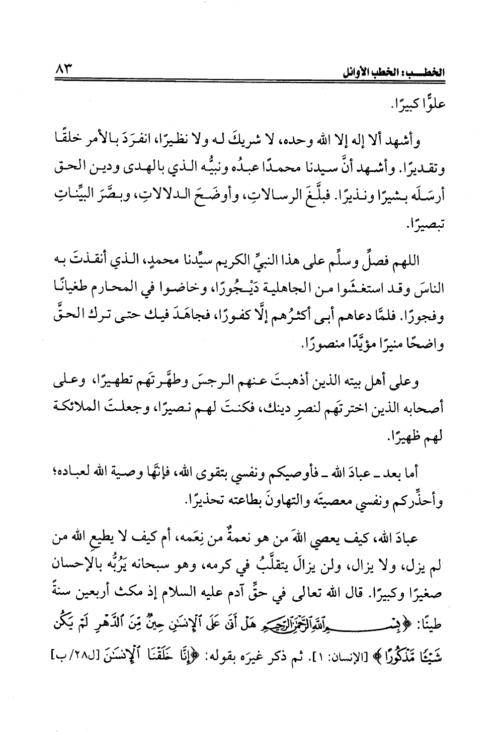 عبادَ الله، كيف يعصي اللهَ من هو نعمةٌ من نِعَمه، أم كيف لا يطيعِ الله من لم يزل، ولا يزال، ولن يزالَ يتقلَّبُ في كرمه، وهو سبحانه يَرُبُّه بالإحسان صغيرًا وكبيرًا. قال الله تعالى في حقِّ آدم عليه السلام إذ مكث أربعين سنةً طينًا: {بِسْمِ اللَّهِ الرَّحْمَنِ الرَّحِيمِ هَلْ أَتَى عَلَى الْإِنْسَانِ حِينٌ مِنَ الدَّهْرِ لَمْ يَكُنْ شَيْئًا مَذْكُورًا} [الإنسان: ١]. ثم ذكر غيرَه بقوله: {إِنَّا خَلَقْنَا الْإِنْسَانَ [ل ٢٨/ب]