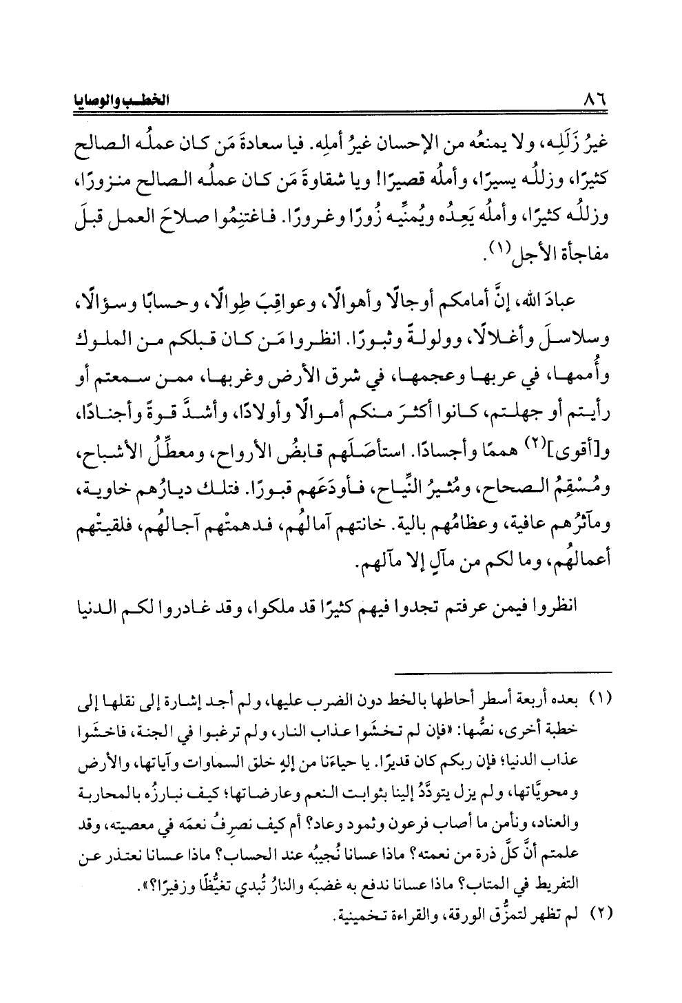 (¬١) بعده أربعة أسطر أحاطها بالخط دون الضرب عليها، ولم أجد إشارة إلى نقلها إلى خطبة أخرى، نصُّها: "فإن لم تخشَوا عذاب النار، ولم ترغبوا في الجنة، فاخشَوا عذاب الدنيا؛ فإن ربكم كان قديرًا. يا حياءَنا من إلهٍ خلق السماوات وآياتها، والأرض ومحويَّاتها، ولم يزل يتودَّدُ إلينا بثوابت النعم وعارضاتها؛ كيف نبارزُه بالمحاربة والعناد، ونأمن ما أصاب فرعون وثمود وعاد؟ أم كيف نصرِفُ نعمَه في معصيته، وقد علمتم أنَّ كلَّ ذرة من نعمته؟ ماذا عسانا نُجيبُه عند الحساب؟ ماذا عسانا نعتذر عن التفريط في المتاب؟ ماذا عسانا ندفع به غضبَه والنارُ تُبدي تغيُّظًا وزفيرًا؟ ".