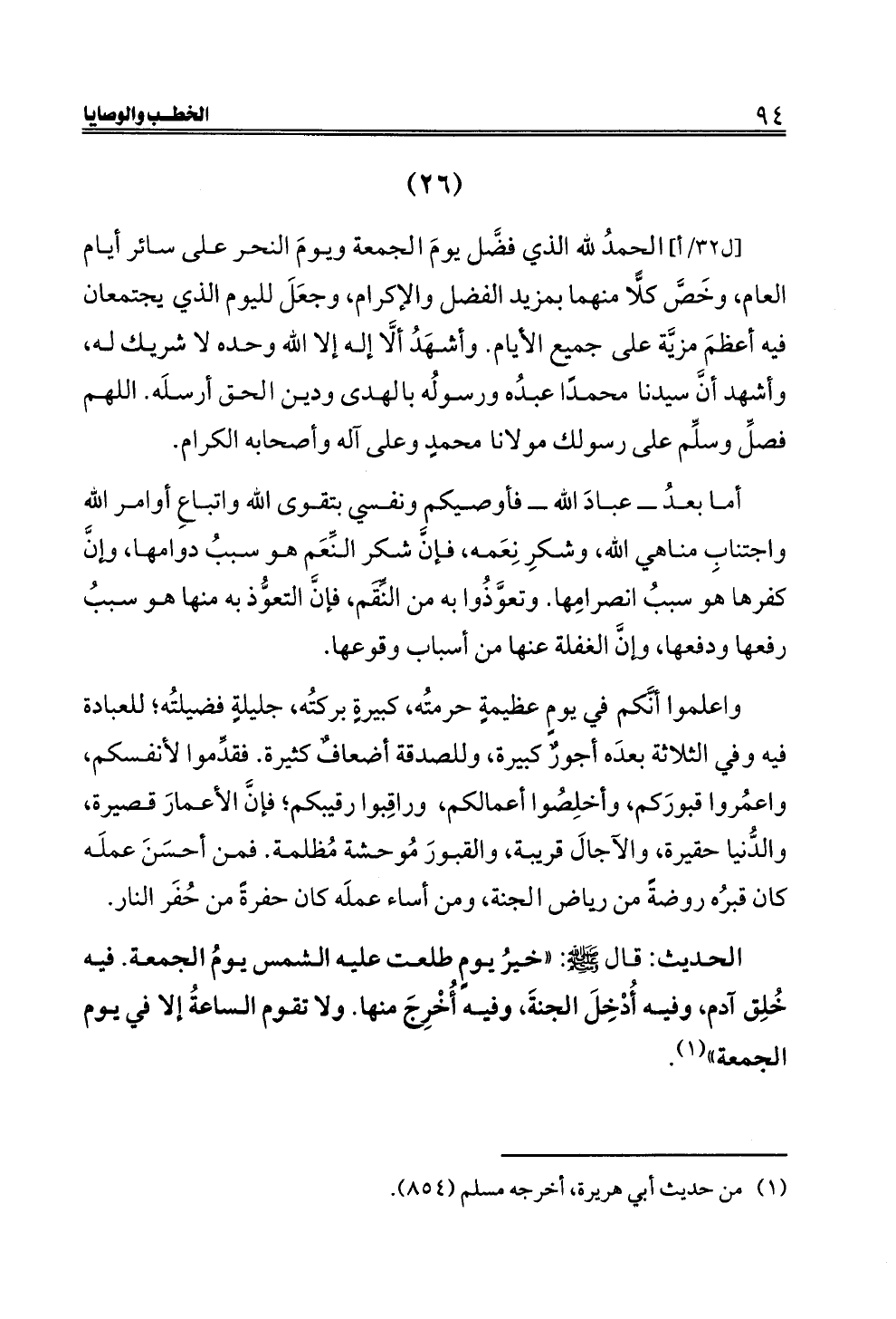 [ل ٣٢/أ] الحمدُ لله الذي فضَّل يومَ الجمعة ويومَ النحر على سائر أيام العام، وخَصَّ كلًّا منهما بمزيد الفضل والإكرام، وجعَلَ لليوم الذي يجتمعان فيه أعظمَ مزيَّة على جميع الأيام. وأشهَدُ ألَّا إله إلا الله وحده لا شريك له، وأشهد أنَّ سيدنا محمدًا عبدُه ورسولُه بالهدى ودين الحق أرسلَه. اللهم فصلِّ وسلِّم على رسولك مولانا محمدٍ وعلى آله وأصحابه الكرام.