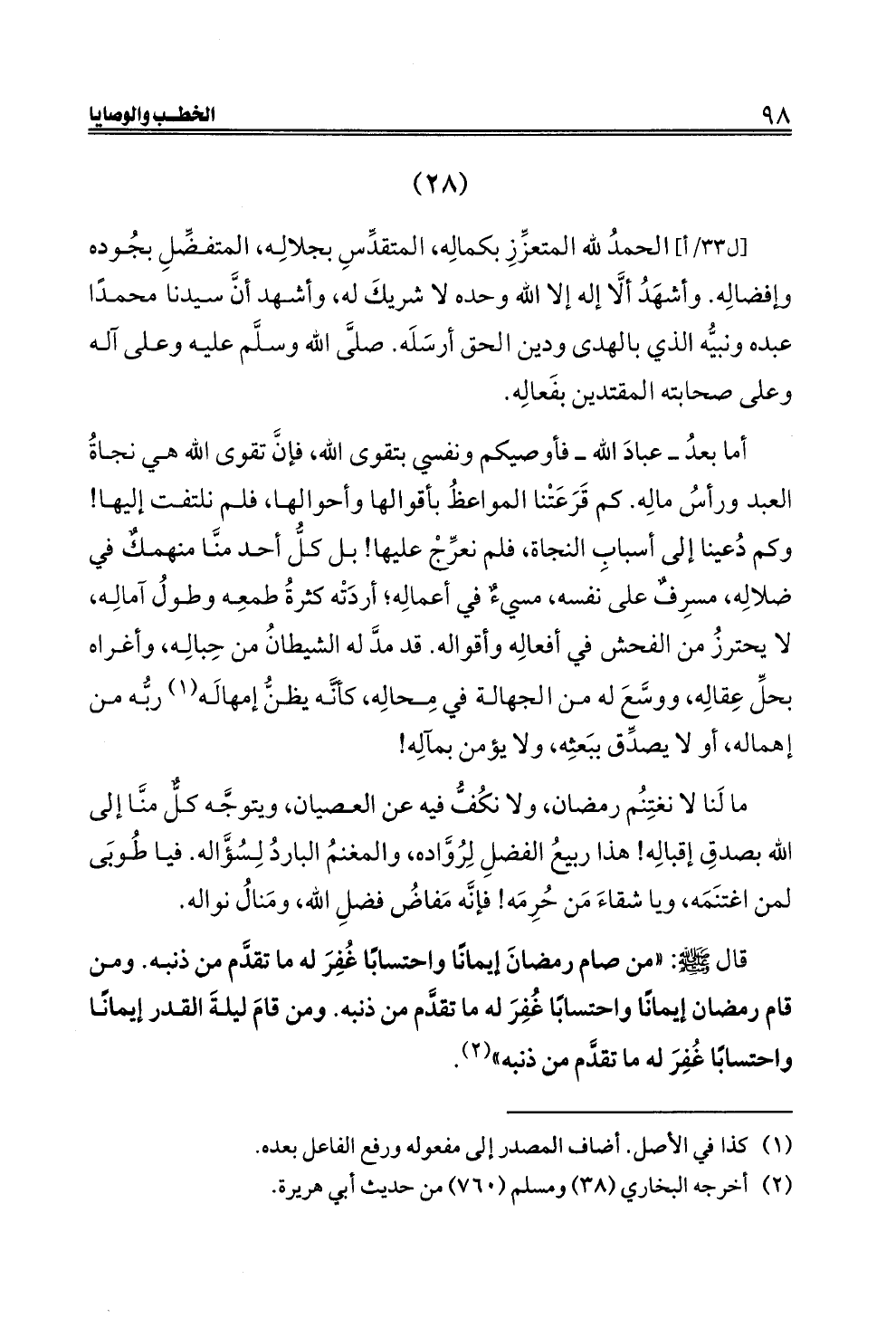 أما بعدُ ــ عبادَ الله ــ فأوصيكم ونفسي بتقوى الله، فإنَّ تقوى الله هي نجاةُ العبد ورأسُ مالِه. كم قَرَعَتْنا المواعظُ بأقوالها وأحوالها، فلم نلتفت إليها! وكم دُعينا إلى أسبابِ النجاة، فلم نعرِّجْ عليها! بل كلُّ أحد منَّا منهمكٌ في ضلالِه، مسرِفٌ على نفسه، مسيءٌ في أعمالِه؛ أردَتْه كثرةُ طمعِه وطولُ آمالِه، لا يحترزُ من الفحش في أفعالِه وأقواله. قد مدَّ له الشيطانُ من حِبالِه، وأغراه بحلِّ عِقالِه، ووسَّعَ له من الجهالة في مِحالِه، كأنَّه يظنُّ إمهالَه (¬١) ربُّه من إهماله، أو لا يصدِّق ببَعثِه، ولا يؤمن بمآلِه!