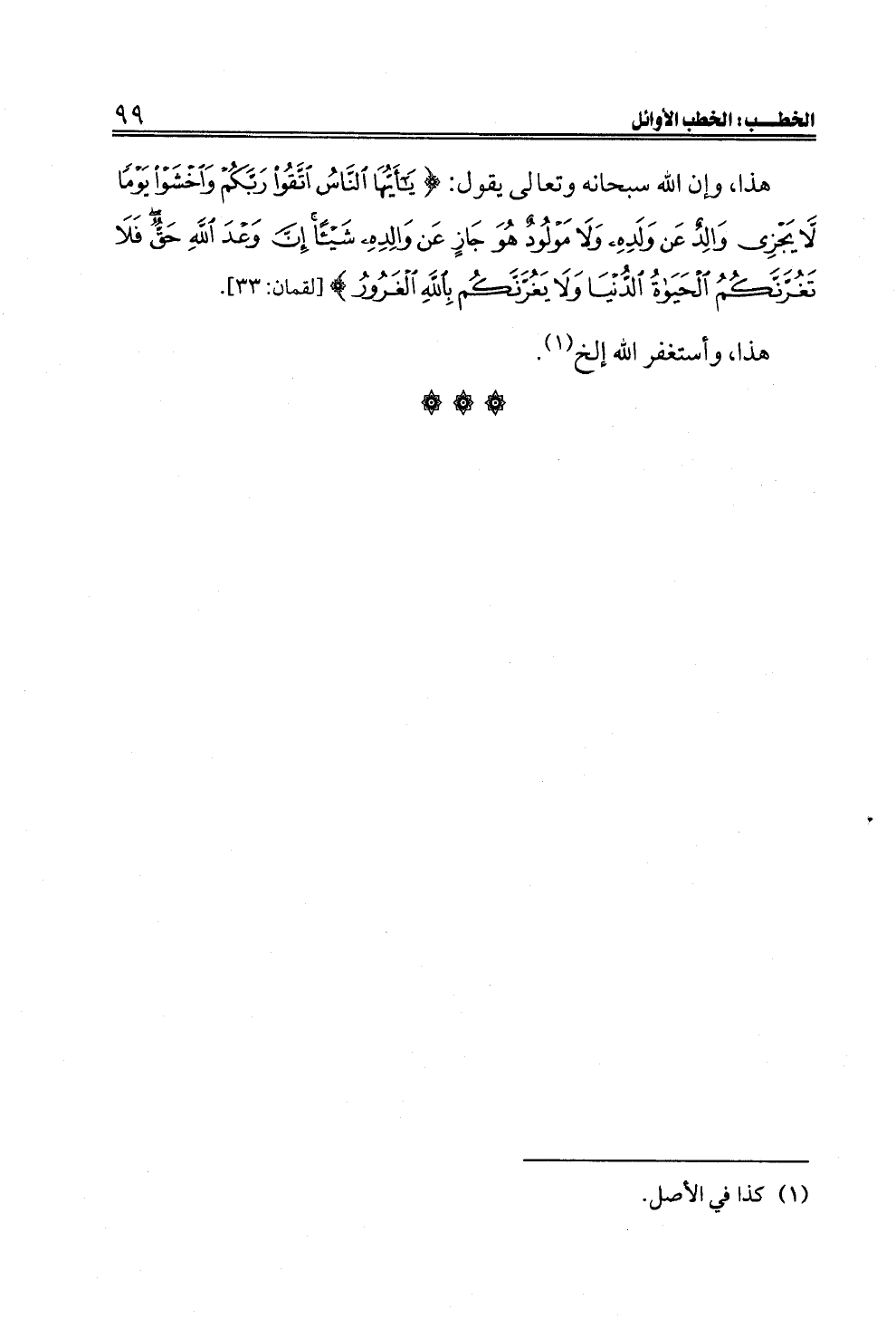 هذا، وإن الله سبحانه وتعالى يقول: {يَاأَيُّهَا النَّاسُ اتَّقُوا رَبَّكُمْ وَاخْشَوْا يَوْمًا لَا يَجْزِي وَالِدٌ عَنْ وَلَدِهِ وَلَا مَوْلُودٌ هُوَ جَازٍ عَنْ وَالِدِهِ شَيْئًا إِنَّ وَعْدَ اللَّهِ حَقٌّ فَلَا تَغُرَّنَّكُمُ الْحَيَاةُ الدُّنْيَا وَلَا يَغُرَّنَّكُمْ بِاللَّهِ الْغَرُورُ} [لقمان: ٣٣].