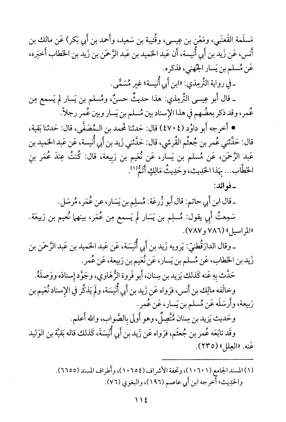 سمعت أبي يقول: مسلم بن يسار لم يسمع من عمر، بينهما نعيم بن ربيعة. «المراسيل» (٧٨٦ و ٧٨٧).