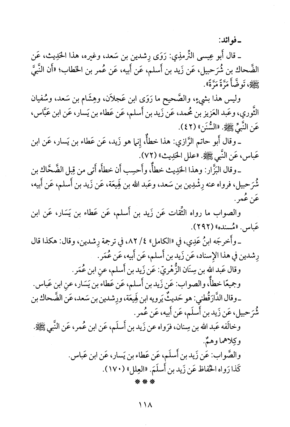 - وقال التِّرمِذي: روى رِشْدِين بن سعد، وغيره، هذا الحديث، عن الضحاك بن شرحبيل، عن زيد بن أسلم، عن أبيه، عن عمر بن الخطاب؛ «أن النبي صَلى الله عَليه وسَلم توضأ مرة مرة».