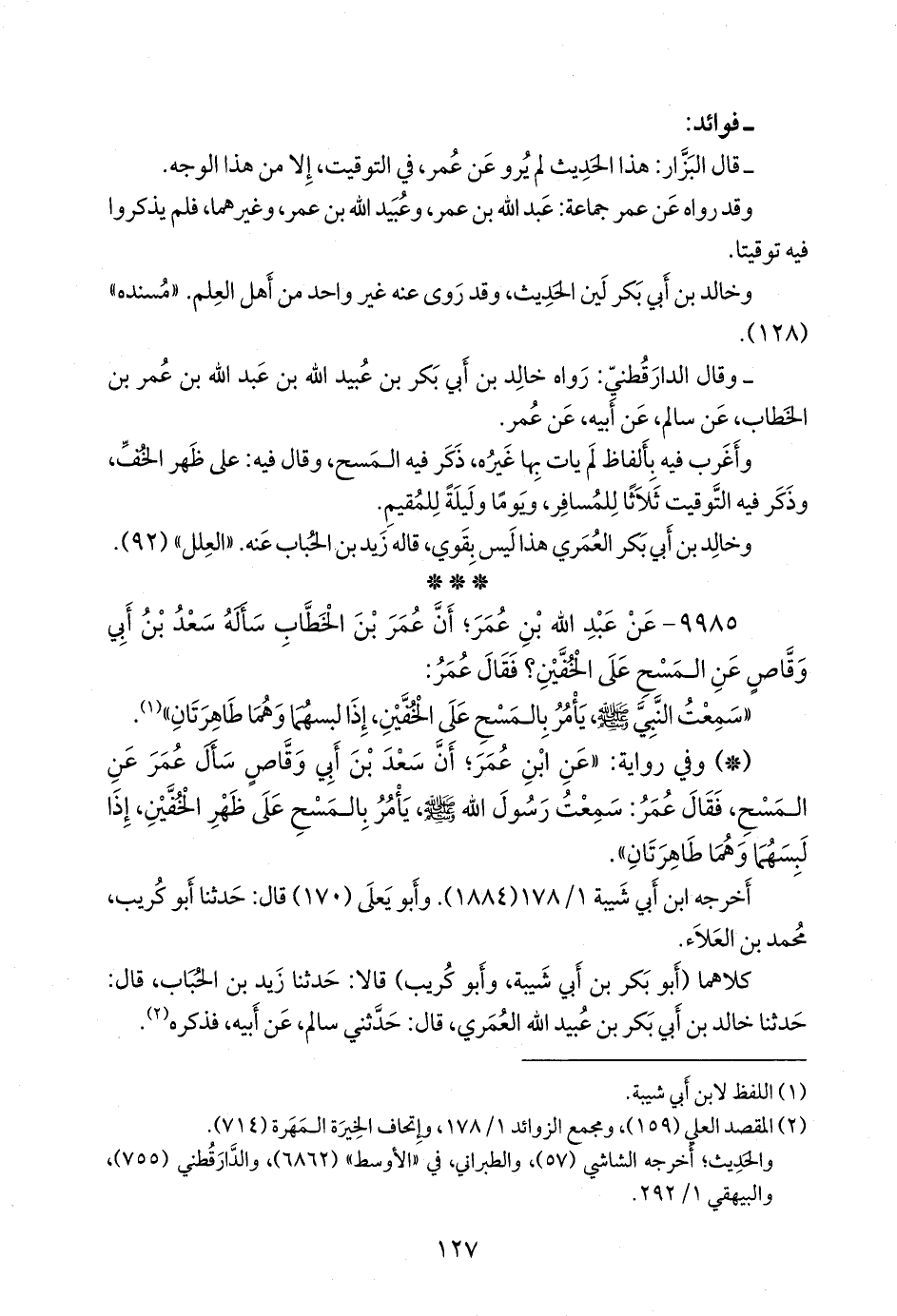 - وفي رواية: «عن ابن عمر؛ أن سعد بن أبي وقاص سأل عمر عن المسح، فقال عمر: سمعت رسول الله صَلى الله عَليه وسَلم يأمر بالمسح على ظهر الخفين، إذا لبسهما وهما طاهرتان».