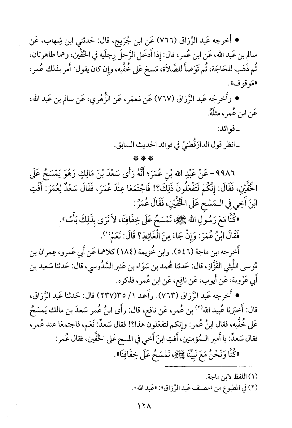 ٩٩٨٦ - عن عبد الله بن عمر؛ أنه رأى سعد بن مالك وهو يمسح على الخفين، فقال: إنكم لتفعلون ذلك؟! فاجتمعا عند عمر، فقال سعد لعمر: أفت ابن أخي في المسح على الخفين، فقال عمر: