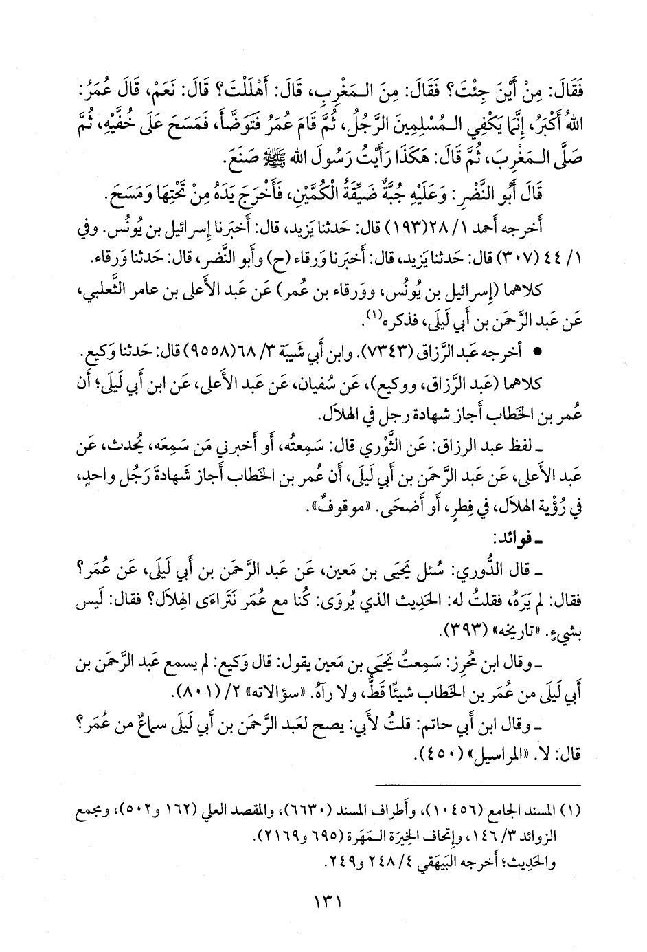 - وقال الدارقُطني: حدثنا أَبو بكر النيسابوري، قال: حدثنا محمد بن يحيى، قال: أخبرنا عبد الرَّحمَن بن مهدي، عن سفيان، عن عبد الأعلى، عن عبد الرَّحمَن بن أبي ليلى، أن عمر أجاز شهادة رجل واحد في رؤية الهلال، في فطر، أو أضحى.