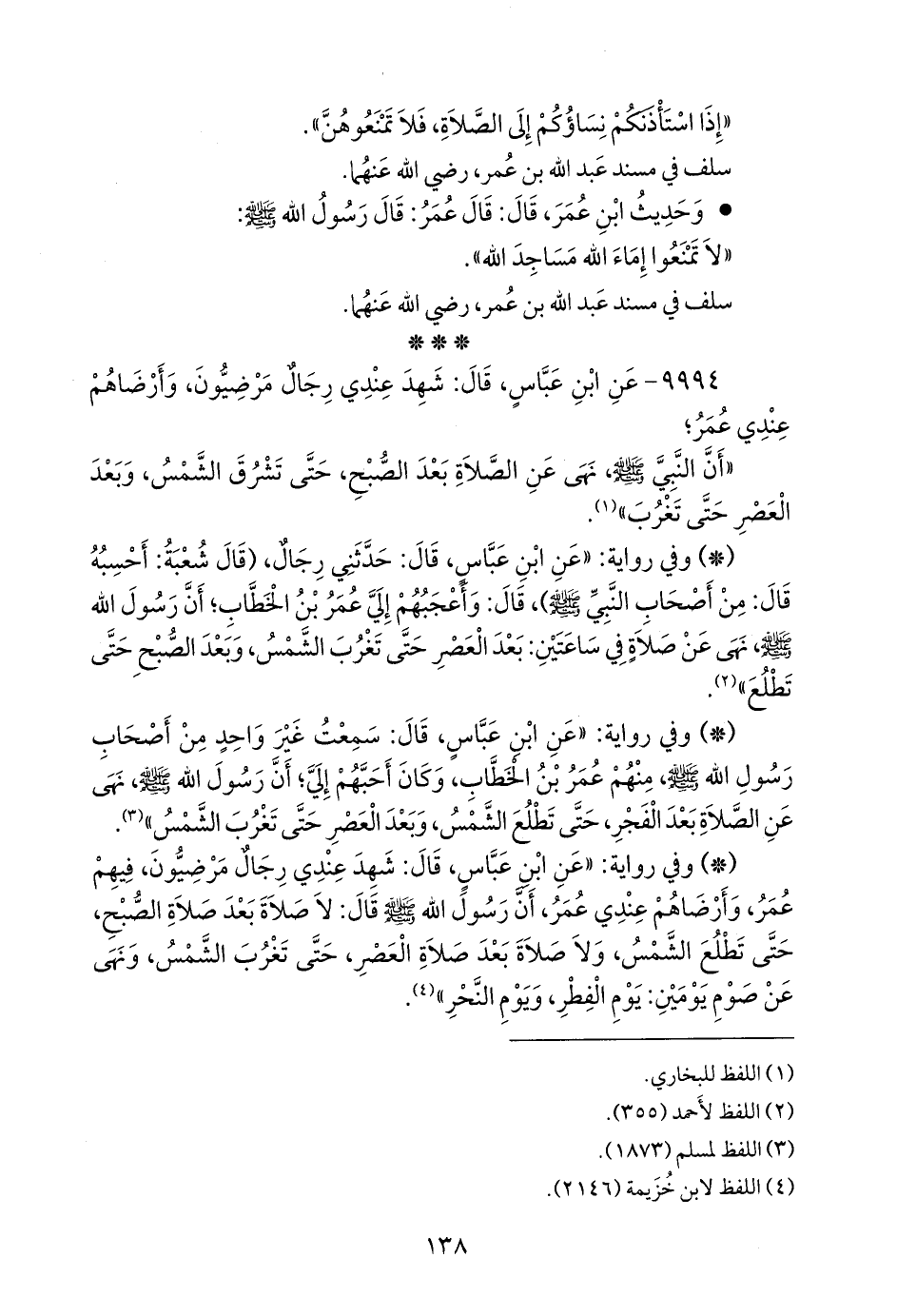 - وفي رواية: «عن ابن عباس، قال: سمعت غير واحد من أصحاب رسول الله صَلى الله عَليه وسَلم منهم عمر بن الخطاب، وكان أحبهم إلي؛ أن رسول الله صَلى الله عَليه وسَلم نهى عن الصلاة بعد الفجر حتى تطلع الشمس، وبعد العصر حتى تغرب الشمس» (¬٣).