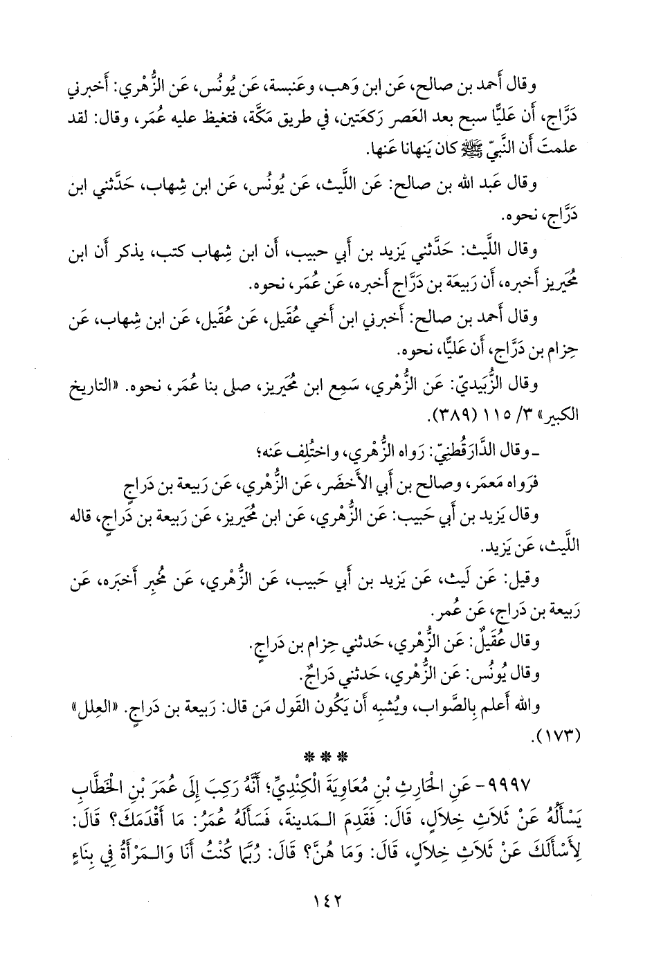 ٩٩٩٧ - عن الحارث بن معاوية الكندي؛ أنه ركب إلى عمر بن الخطاب يسأله عن ثلاث خلال، قال: فقدم المدينة، فسأله عمر: ما أقدمك؟ قال: لأسألك عن ثلاث خلال، قال: وما هن؟ قال: ربما كنت أنا والمرأة في بناء