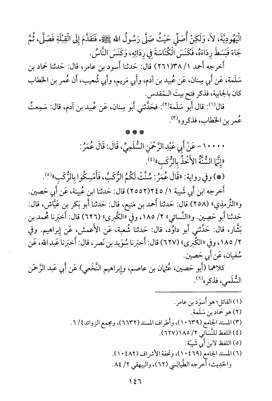 • أَخرجه عبد الرزاق (٢٨٦٣) عن ابن عُيينة، عن أبي حصين، قال: رأيت شيخا كبيرا، عليه برنس، قال ابن عُيينة: يعني الأسود بن يزيد، إذا ركع ضم يديه بين ركبتيه، قال: فأتينا أبا عبد الرَّحمَن السلمي فأخبرناه، فقال: نعم، أولئك أصحاب عبد الله بن مسعود، ولكن عمر قد سن لكم الركب، فخذوا بالركب، «موقوف».