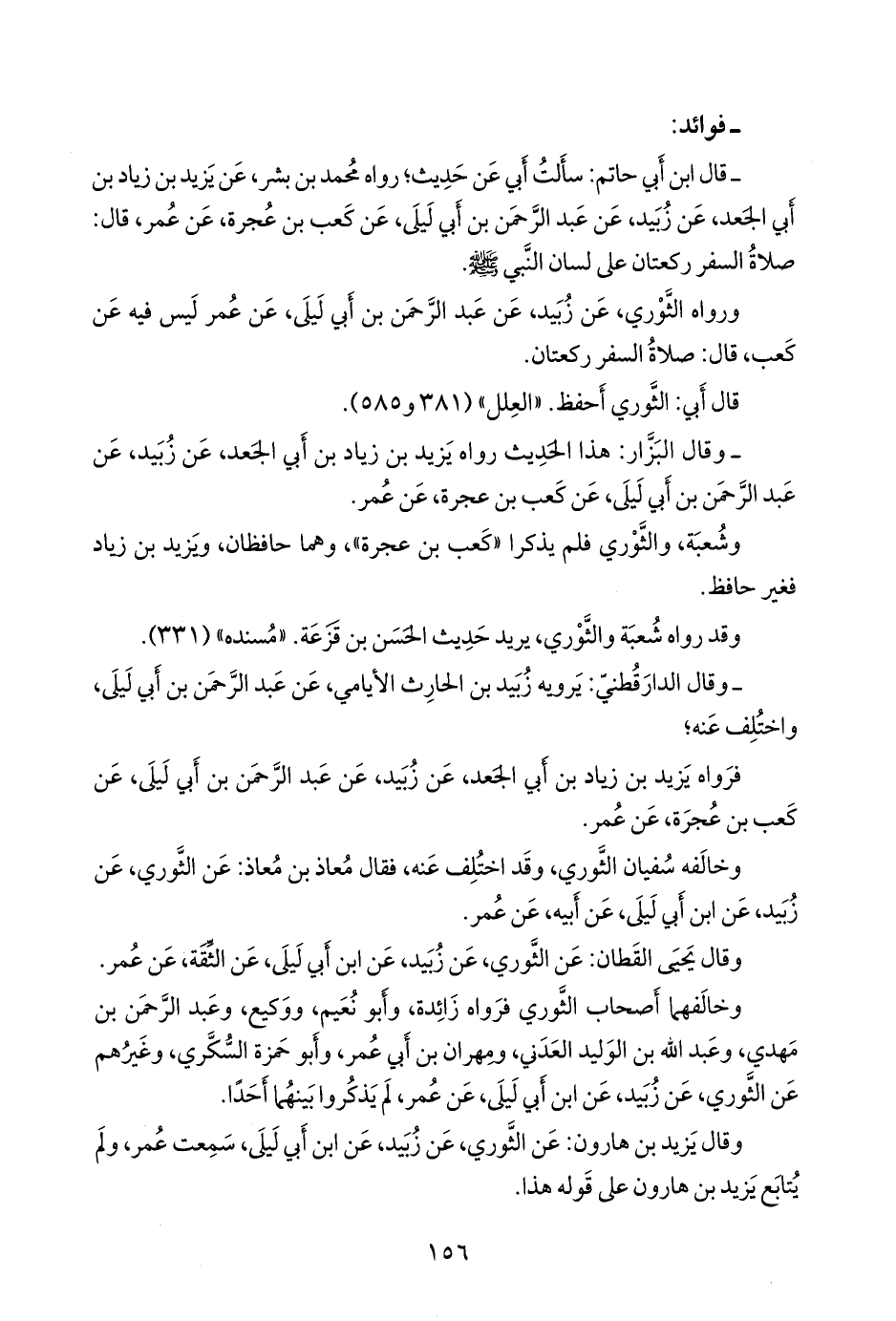 - قال عبد الرَّحمَن بن أبي حاتم الرازي: سألتُ أبي عن حديثٍ؛ رواه محمد بن بشر، عن يزيد بن زياد بن أبي الجعد، عن زبيد، عن عبد الرَّحمَن بن أبي ليلى، عن كعب بن عجرة، عن عمر، قال: صلاة السفر ركعتان على لسان النبي صَلى الله عَليه وسَلم.