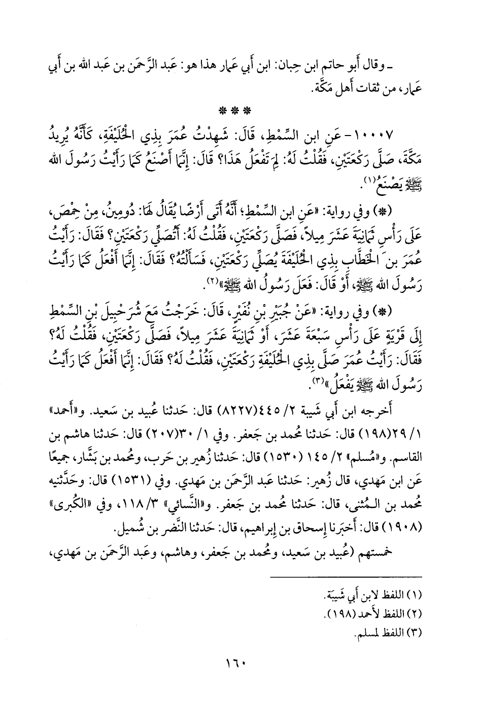 - وفي رواية: «عن جُبير بن نُفير، قال: خرجت مع شُرحبيل بن السِّمْط إلى قرية على رأس سبعة عشر، أو ثمانية عشر ميلا، فصلى ركعتين، فقلت له؟ فقال: رأيت عمر صلى بذي الحليفة ركعتين، فقلت له؟ فقال: إنما أفعل كما رأيت رسول الله صَلى الله عَليه وسَلم يفعل» (¬٣).