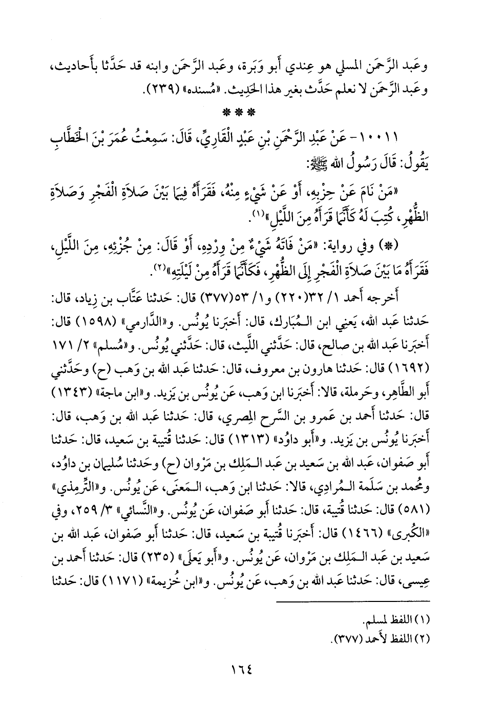 - وفي رواية: «من فاته شيء من ورده، أو قال: من جزئه، من الليل، فقرأه ما بين صلاة الفجر إلى الظهر، فكأنما قرأه من ليلته» (¬٢).