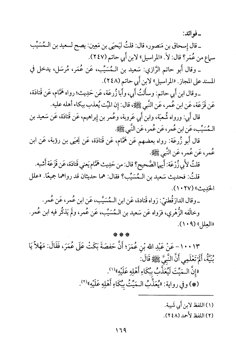 - وقال ابن أبي حاتم: وسألت أبي، وأَبا زُرعَة، عن حديث؛ رواه همام، عن قتادة، عن قَزَعَة، عن ابن عمر، عن النبي صَلى الله عَليه وسَلم قال: إن الميت يعذب ببكاء أهله عليه.