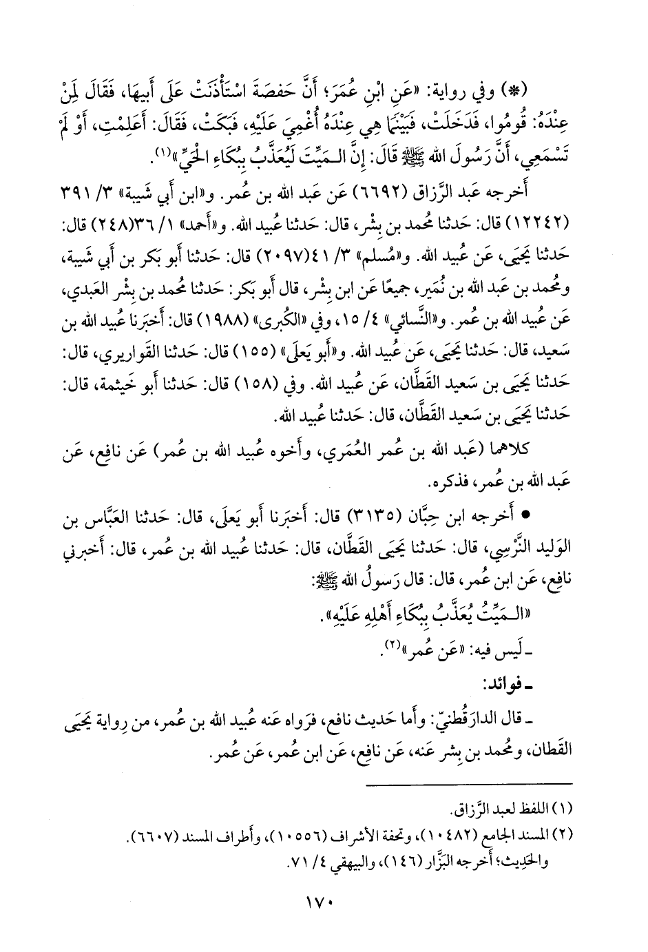 - قال الدارقُطني: وأما حديث نافع، فرواه عنه عُبيد الله بن عمر، من رواية يحيى القطان، ومحمد بن بشر عنه، عن نافع، عن ابن عمر، عن عمر.